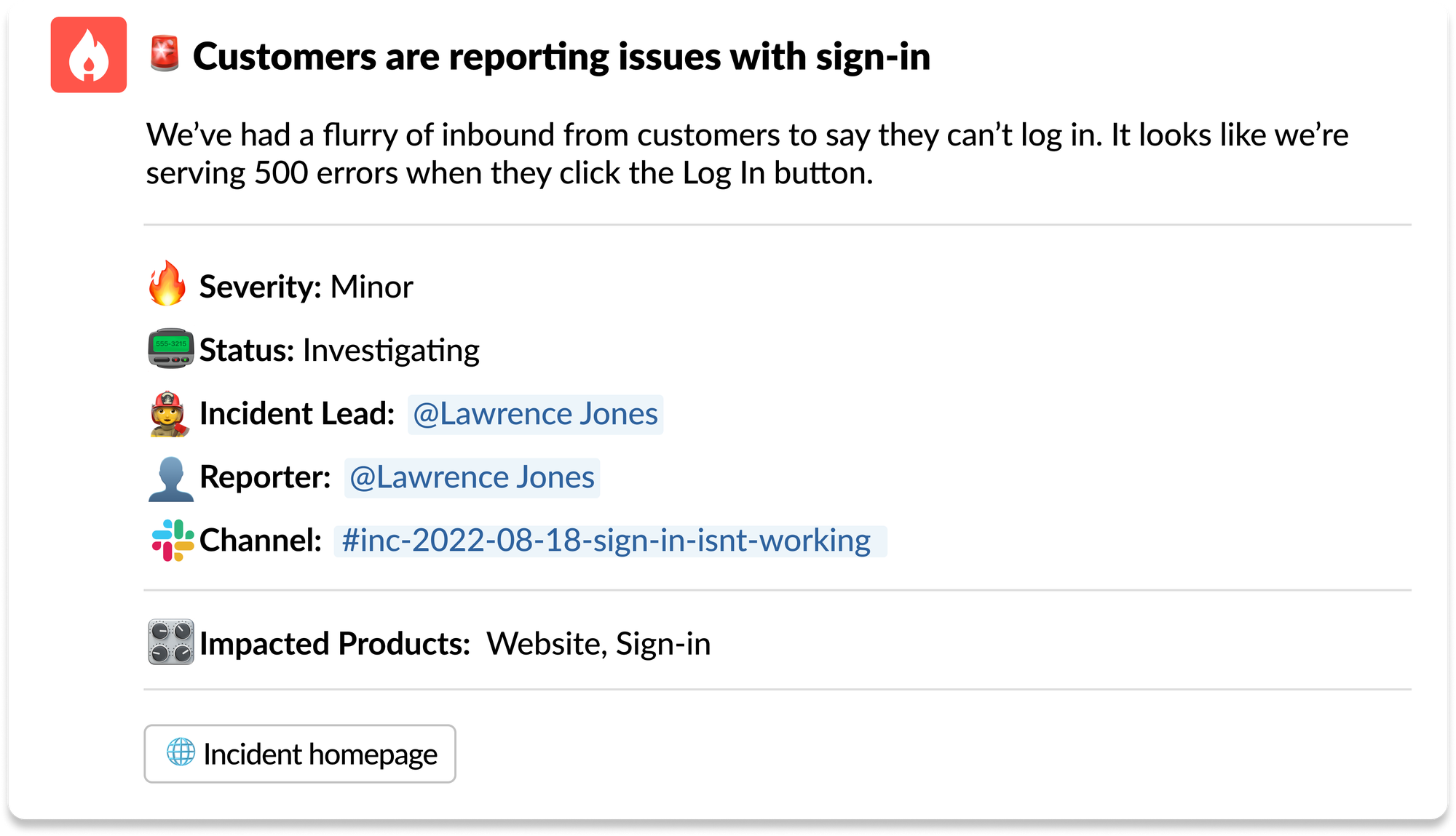 With a central channel where each incident is announced, everyone can see a concise summary of each incident, who reported it, who’s leading and a number of other useful data points quickly and easily.