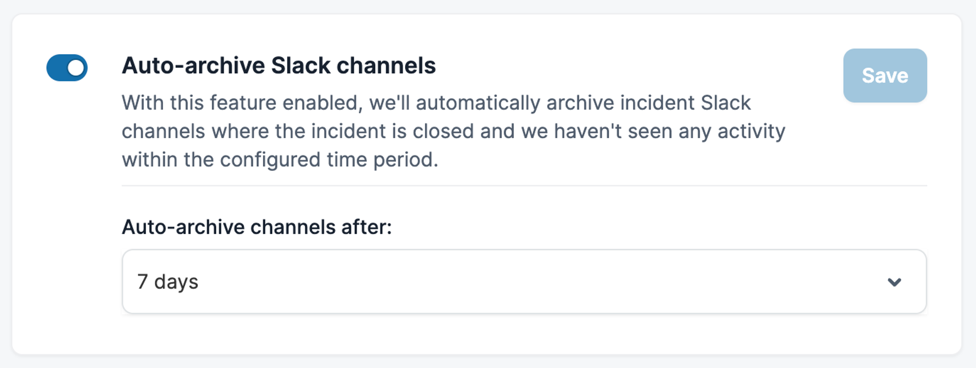 If, like me, you’ve spent many hours painstakingly curating your Slack sidebar to keep things organised, you’ll be pleased to hear our incident channels aren’t going to break that. Nobody wants old channels lying around, so we’ve built a smart archiving feature which understands the state of incidents – and under conditions you control – closes and archives old channels.