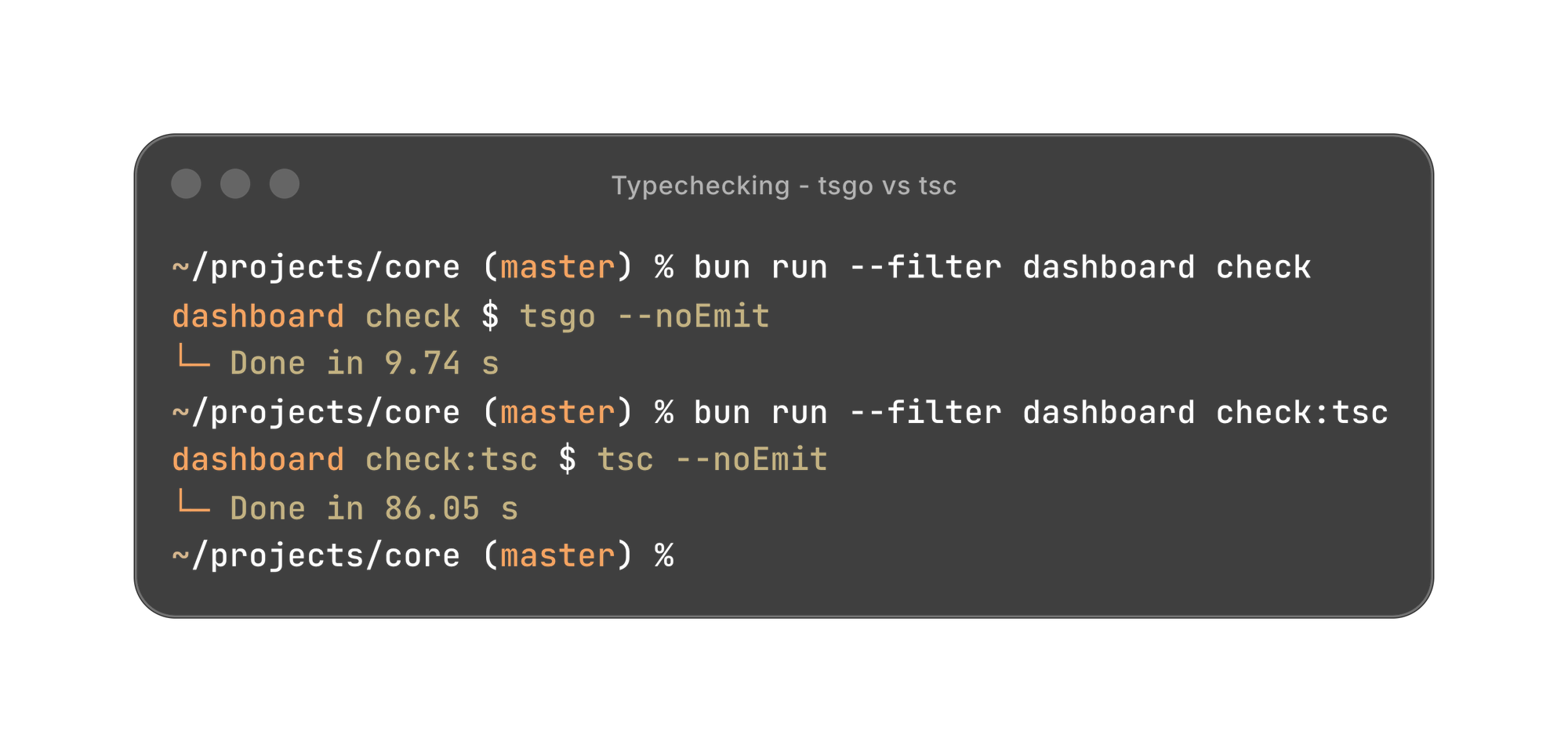 We didn't just switch everyone over immediately. We made it opt-in first. bun check:tsgo ran alongside the regular bun check. We’ve long been using swc to generate the actual bundle we ship, so we were confident the actual build output wouldn’t change. A few people tried it out for a couple of weeks, reported back that it seemed fine, and then we flipped it to be the default.