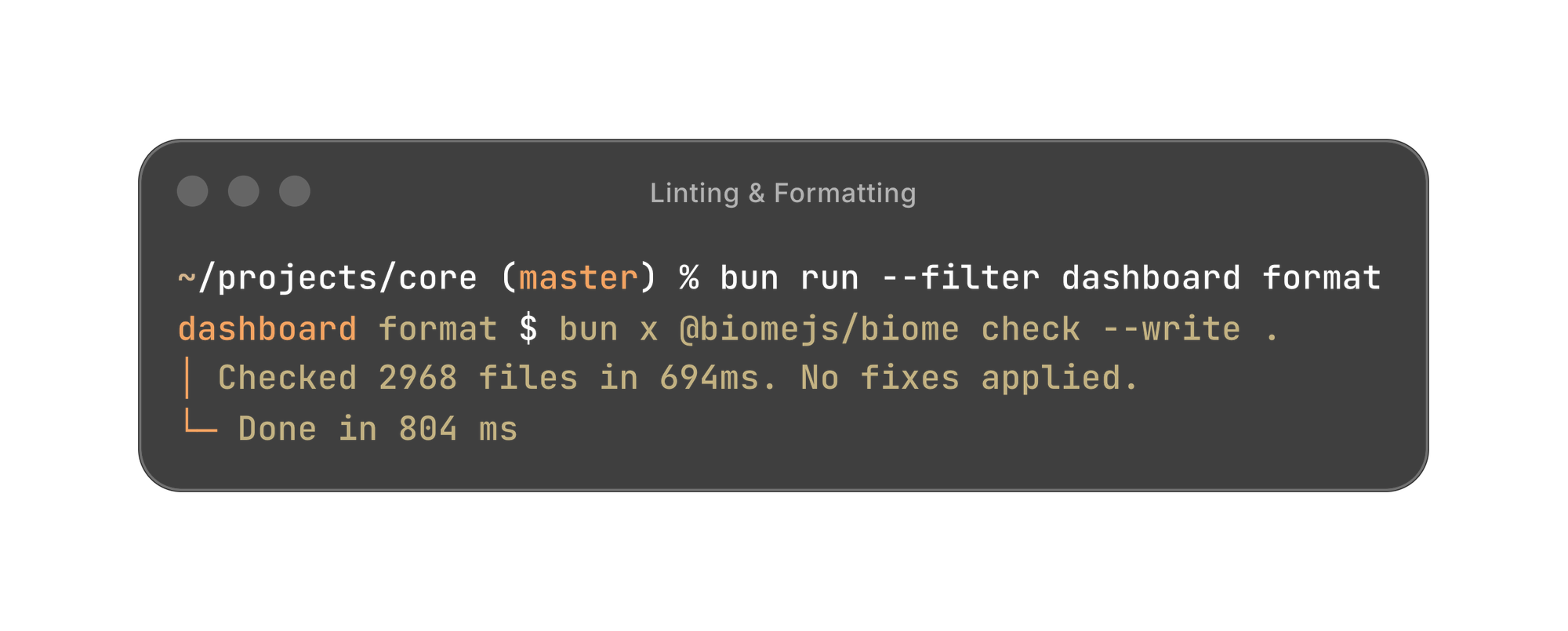 Let's start with the most pragmatic decision we made: switching from ESLint and Prettier to Biome. Our linting and formatting used to take 40 seconds (without caching). With Biome, it takes less than one second.