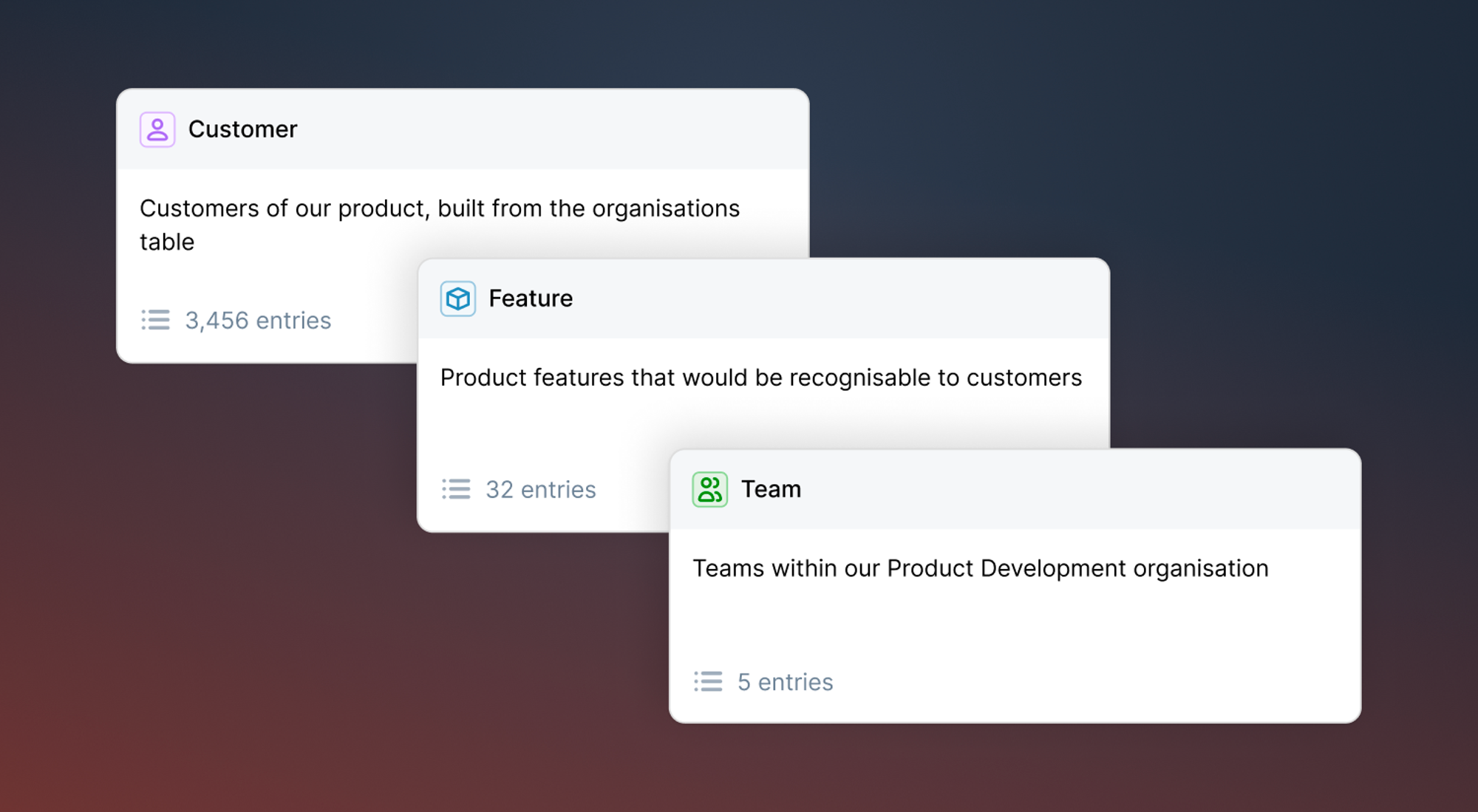 In a nutshell, a lot! But let’s imagine we had a Catalog containing a list of customers, product features, and company teams. In this scenario, our Catalog might look something like this: