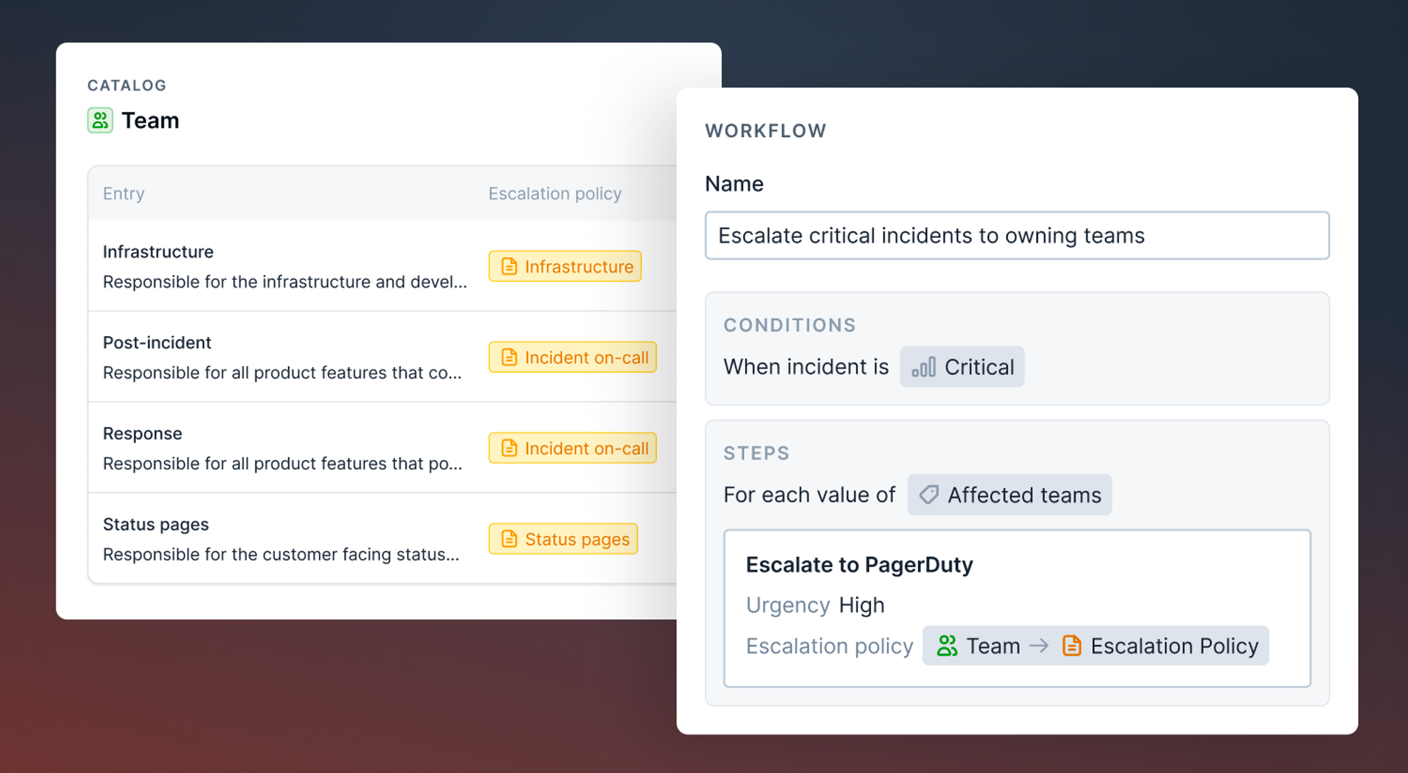 We’ve rebuilt much of our product to become Catalog-aware, and Workflows is no exception. Now, when someone in Customer Support raises a critical incident that’s impacting a product feature, we can have a workflow that jumps from product feature to owning team, and from owning team to their PagerDuty Service, where it triggers a page.