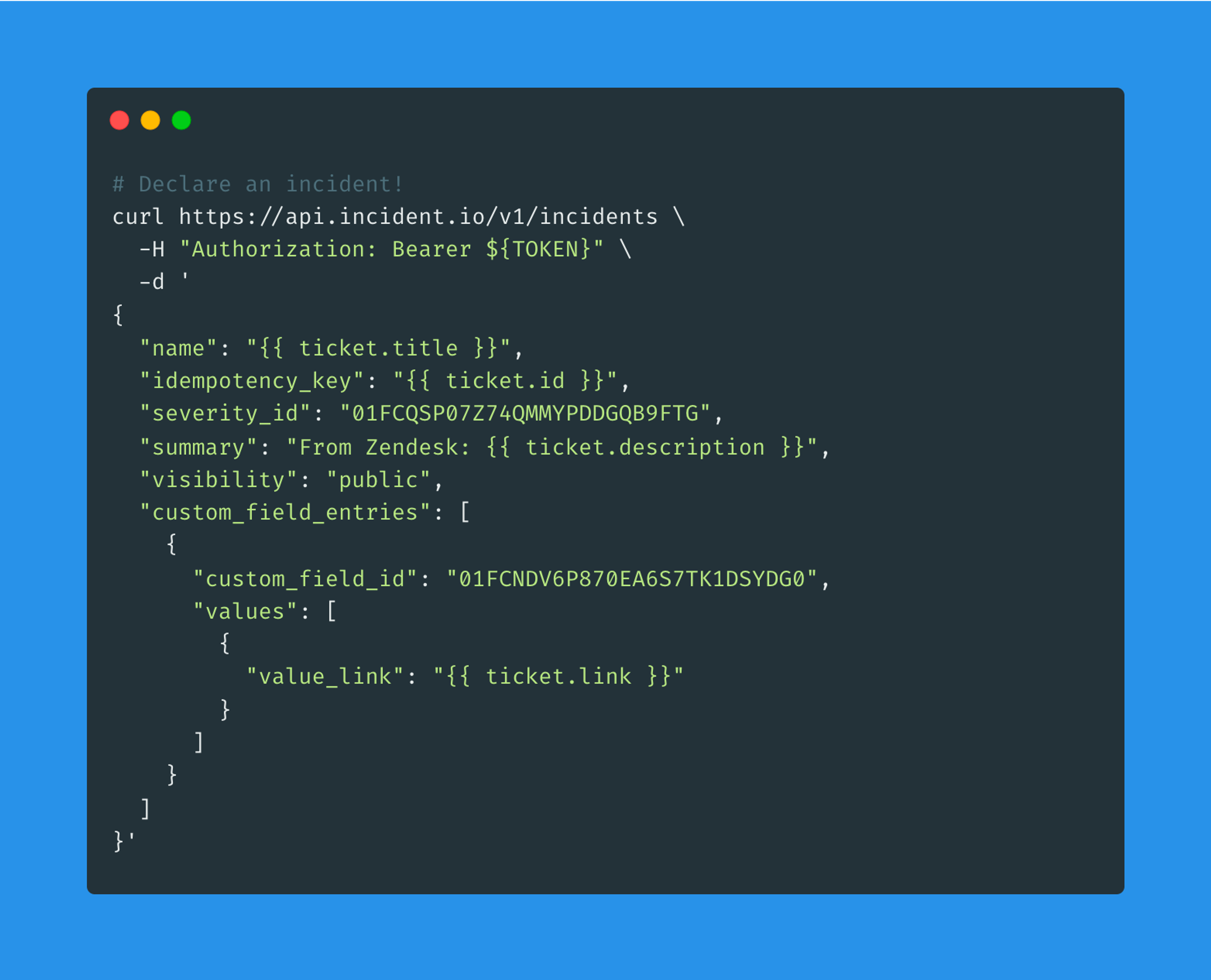 custom_field_id references a “Zendesk Ticket Link” custom field we’ve configured. You can find the IDs of your custom fields using the List Custom Fields API.severity_id references our “Minor” severity. You can find the IDs of your severities using the List Severities API.That’s it! 🎉 Whenever that trigger fires, you’ll get a new incident declared in incident.io. Nice.