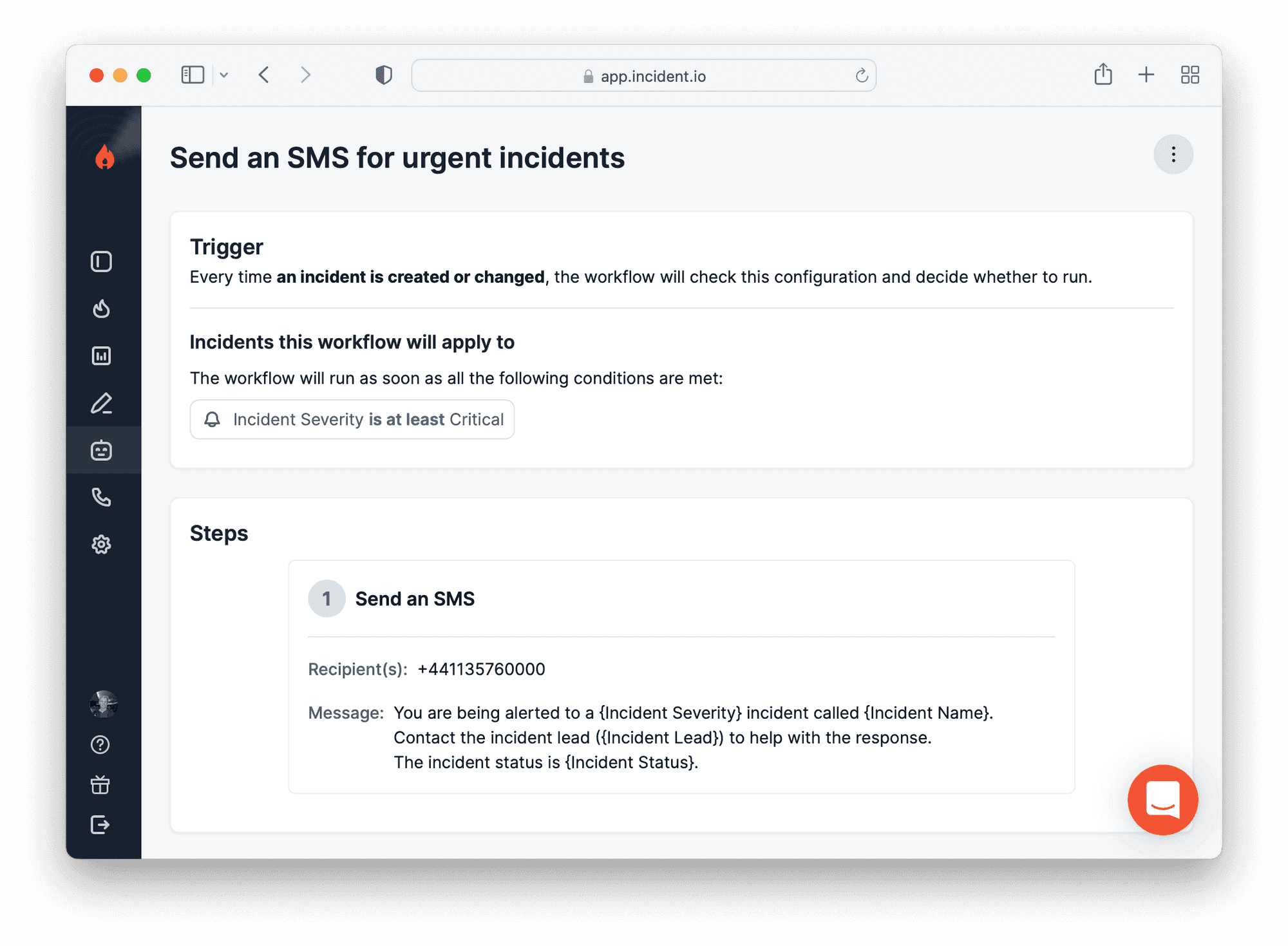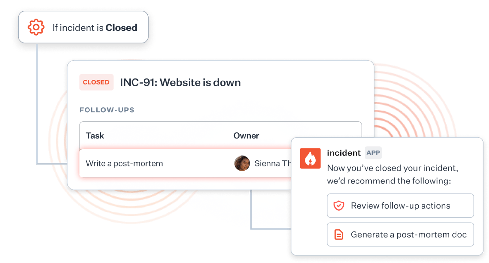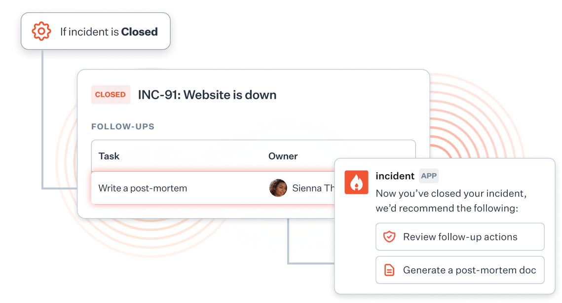 This could look like nudging folks to email stakeholders when a high-severity incident is created. Or sending status SMS to specific teams when a certain Incident Type is created.