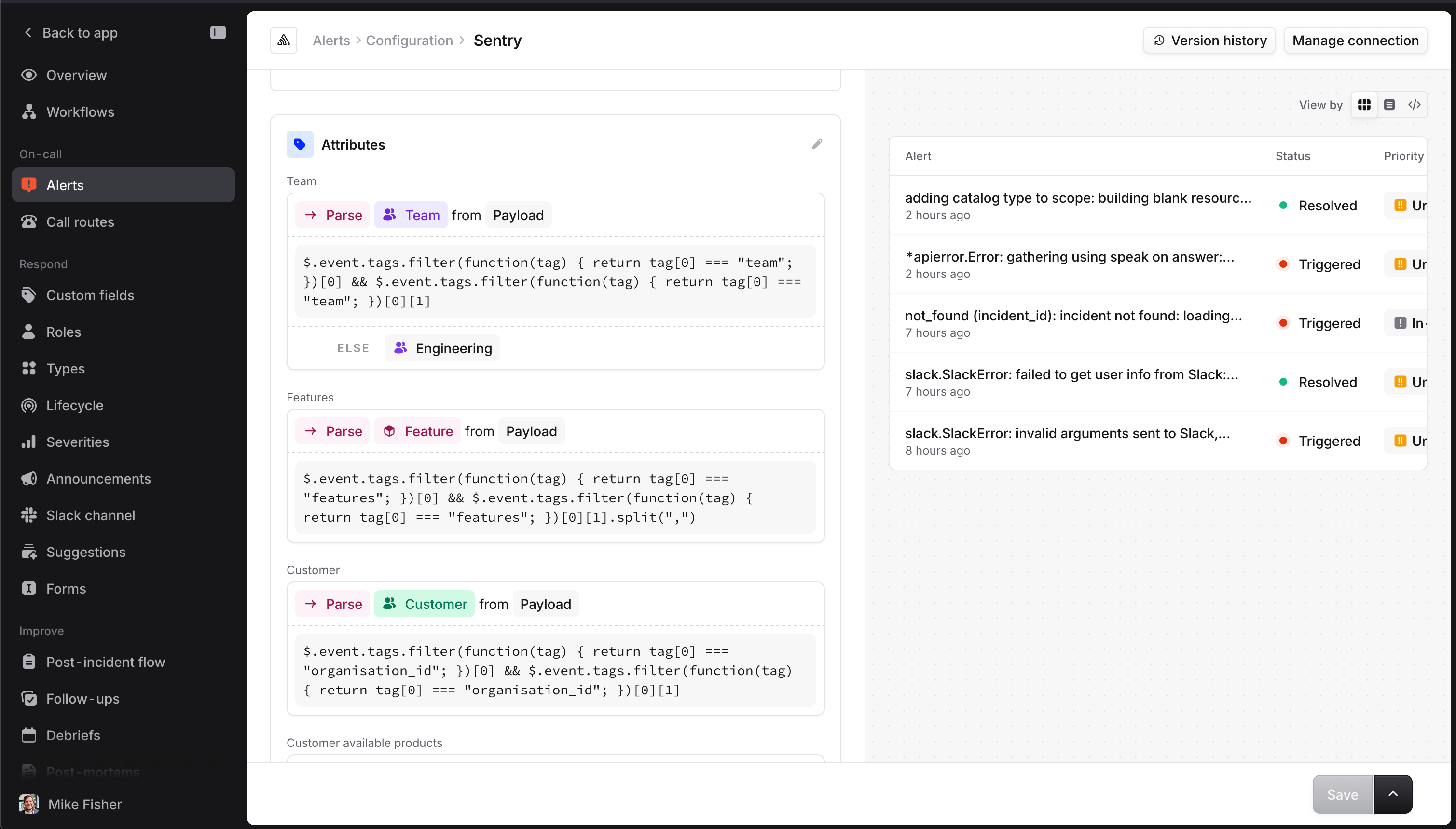 In our set up, we have these “Team” and “Features” columns in the UI too. Teams are a first class citizen in incident.io, but a “Feature” is a concept that we’ve defined ourselves. Both are powered by Catalog. Any incident.io customer can model anything they want in Catalog, and then define rules to tell us how to match an Alert to a specific entry.
