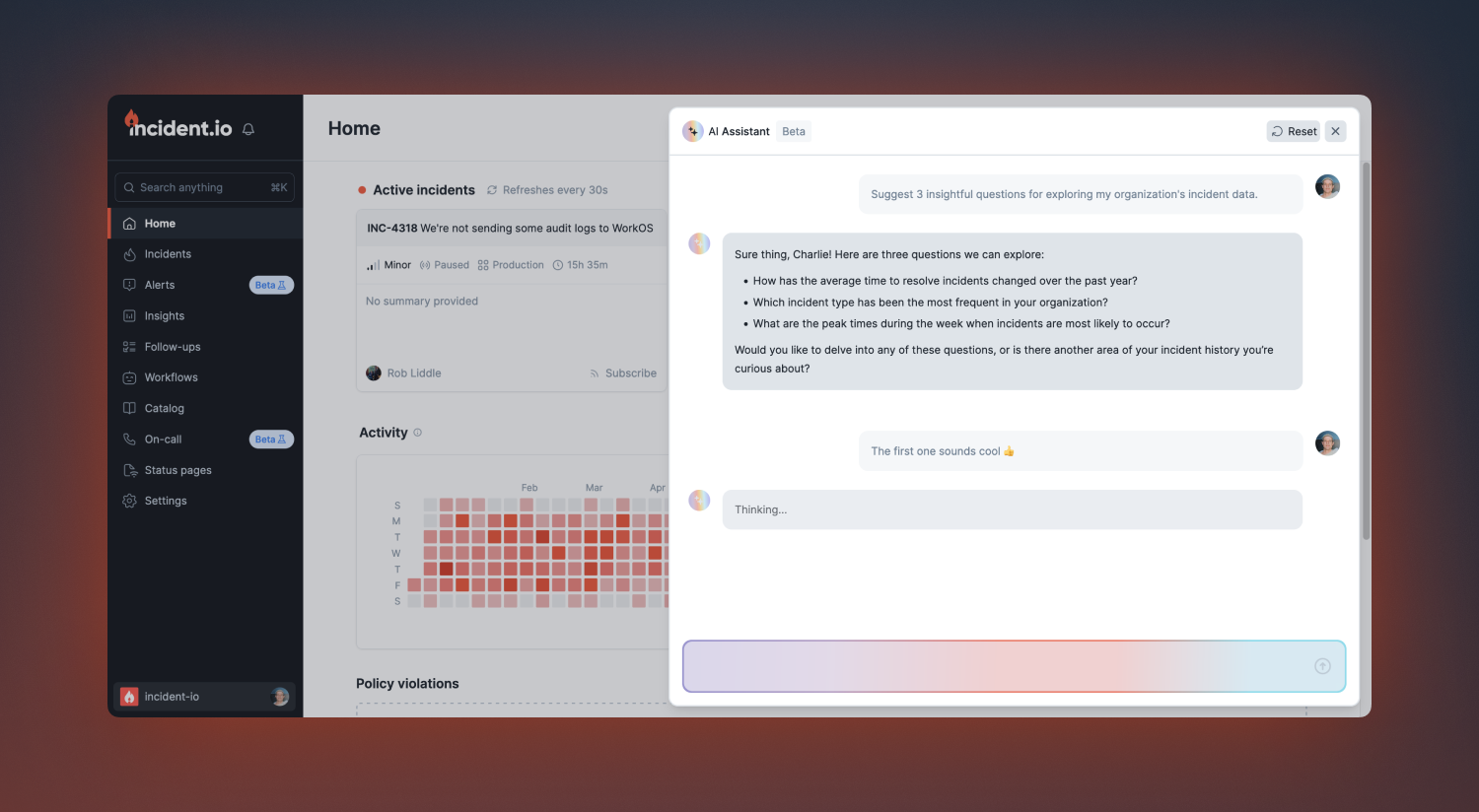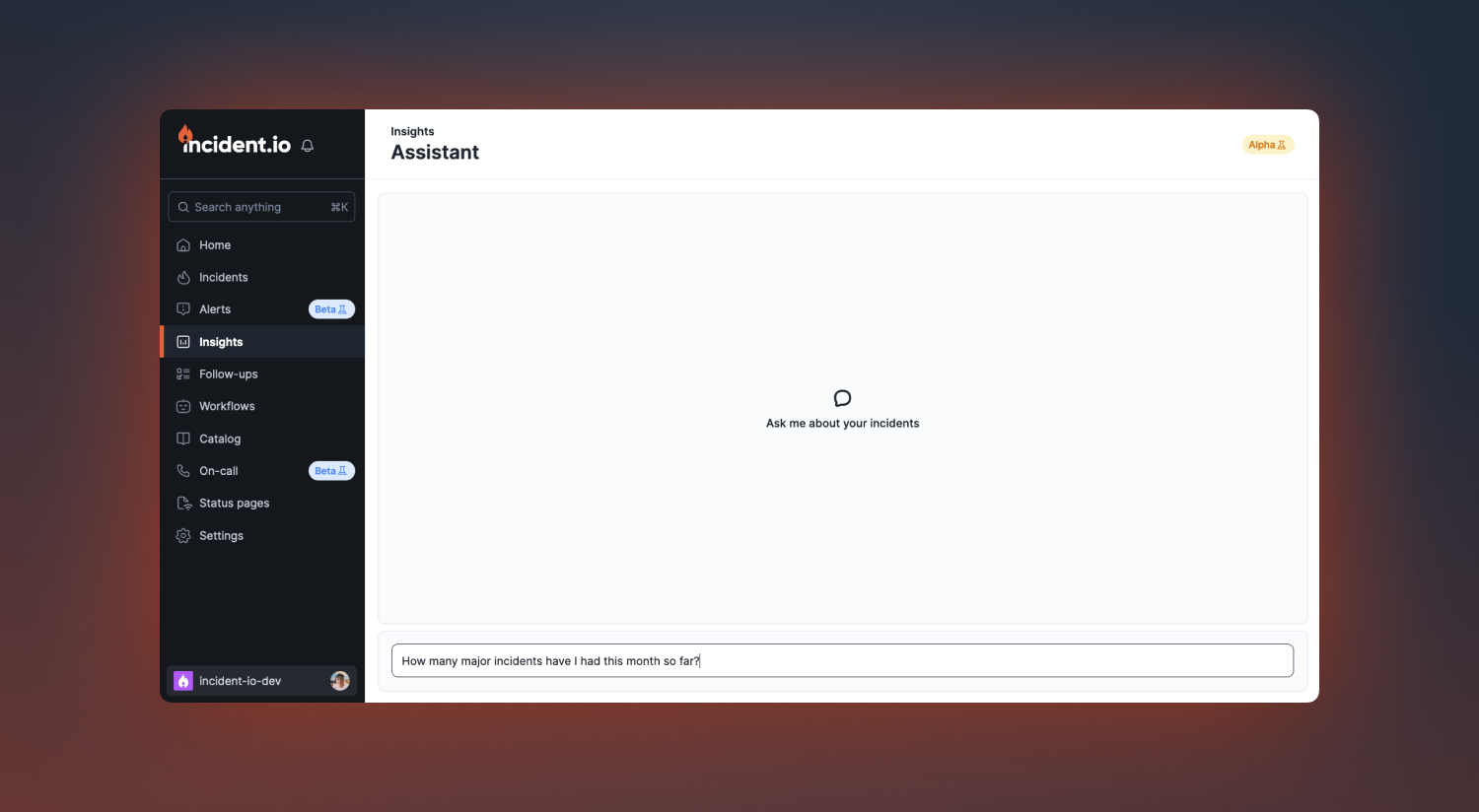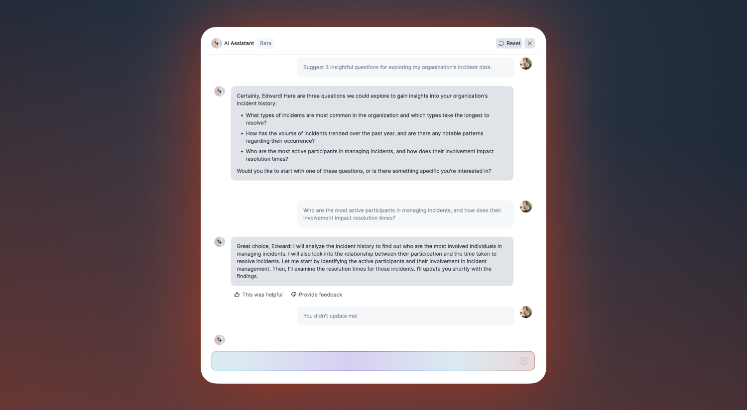 Using this user feedback as our inspiration, we came up with the idea of a natural language assistant that you can use to explore your incident data. But we were skeptical about the value of this, and so the task to prove this idea had any legs was picked up by one of our engineers.