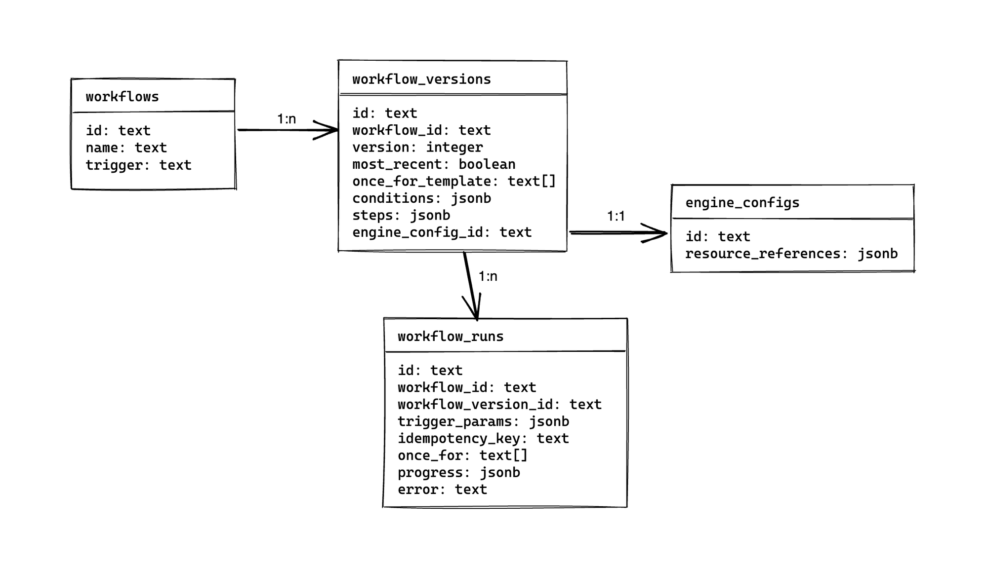 For each workflow_versions row we also store an engine_configs. We don’t make use of this for workflow execution: these rows store a JSONB array of referenced resources that, backed by a GIN-index, allow us to quickly find any workflows that might reference other incident.io resources (such as a custom field) so we can warn before you delete them.