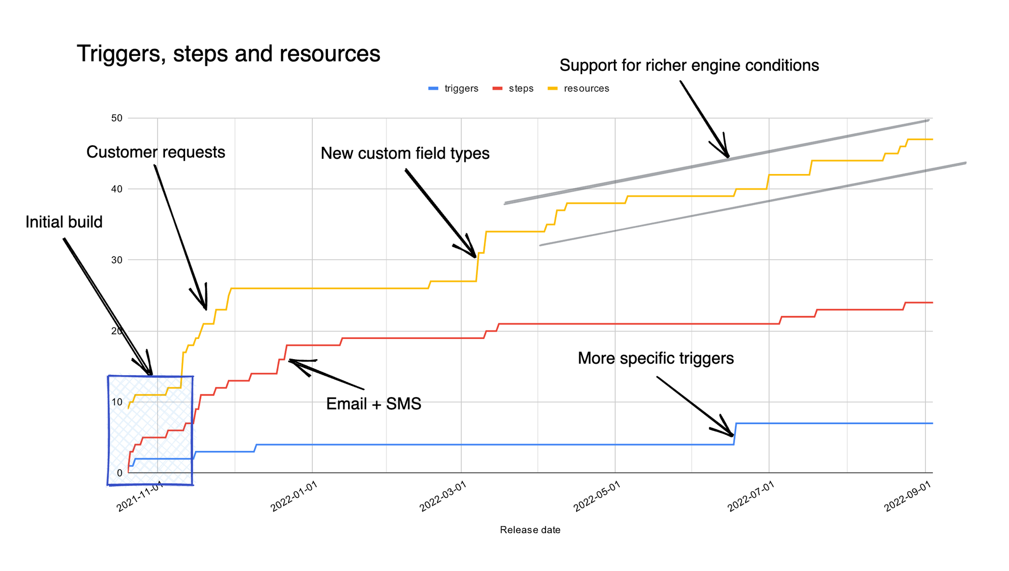The chart spans almost 10 months, and shows how the majority of workflow functionality has been added after the initial build of the framework. In fact, we have more than 2x as many triggers and steps and almost 3x as many resources, all built in response to customers demand.