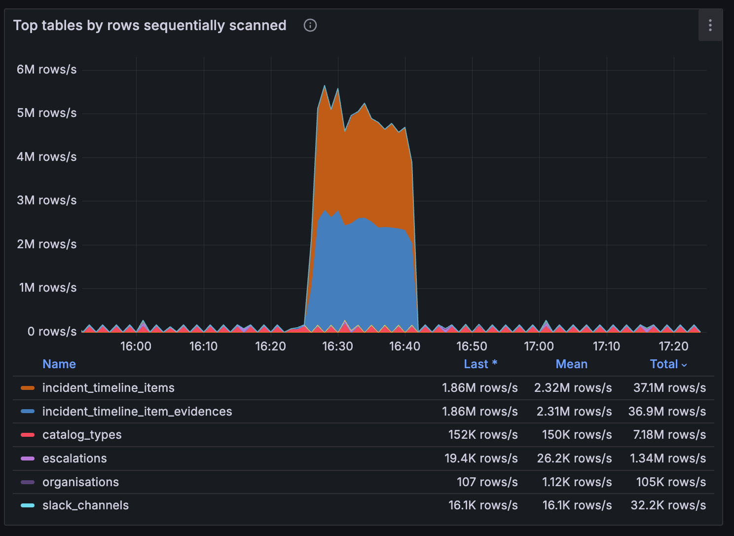 The code for this chart is as follows, so to recreate this yourself you’ll just need to add a metric like pg_stat_user_tables_seq_tup_read which tracks the number of rows fetched by sequential scans on a particular table.
