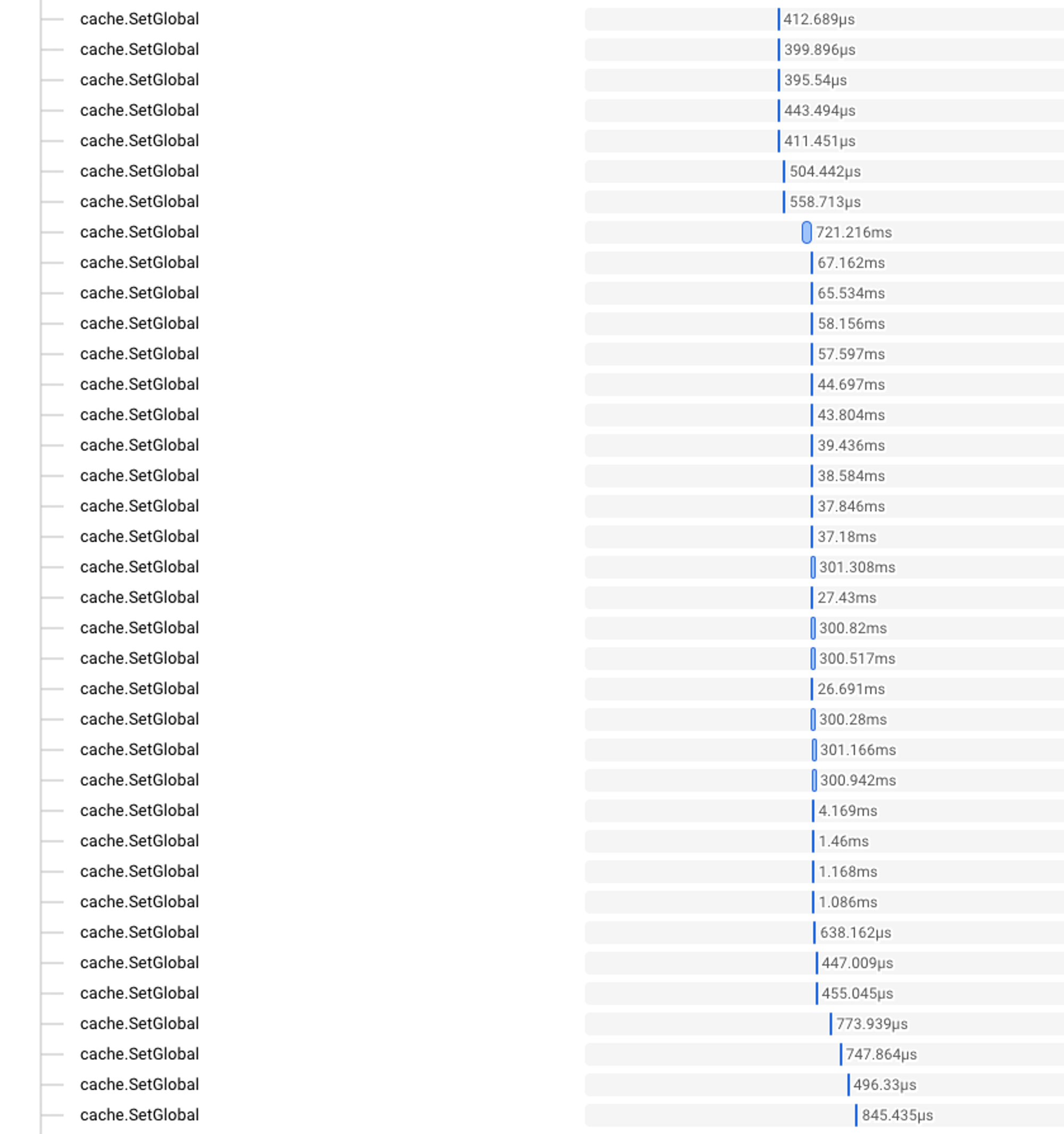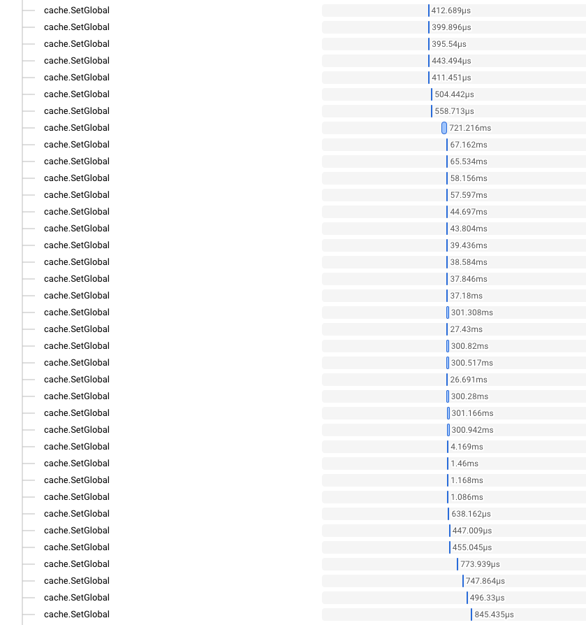 Taking a look at the trace for the request, we could see something pretty interesting. There were a few hundred cache set operations happening, seemingly simultaneously, for one request. There were also a ton of calls to generate URLs for objects in Google Cloud Storage at the same time.