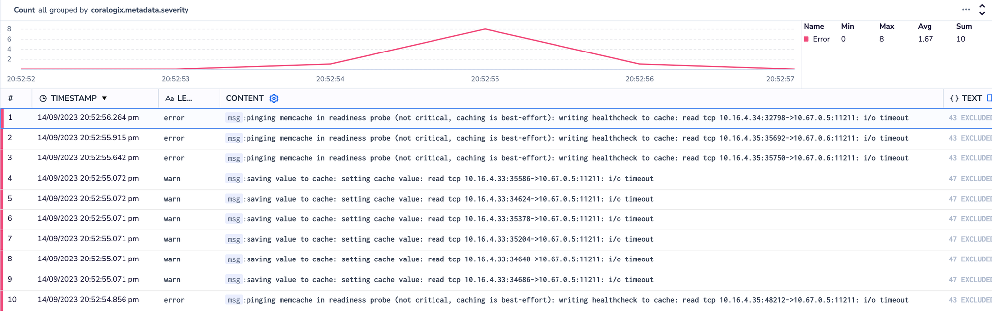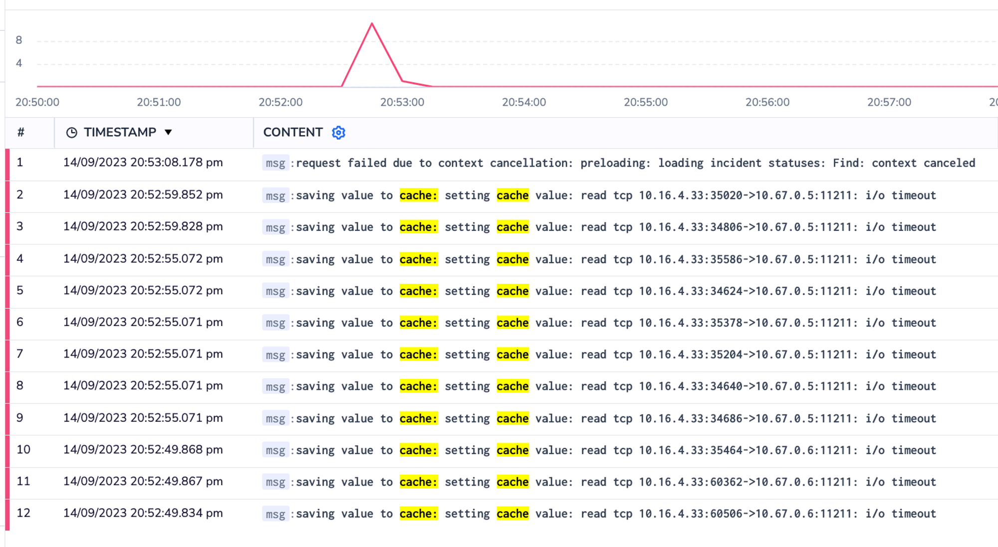 The next day, we took a closer look at the logs for the Kubernetes node which had handled one of the affected requests. We could clearly see multiple cache failures happen during this request, all due to cache timeouts.