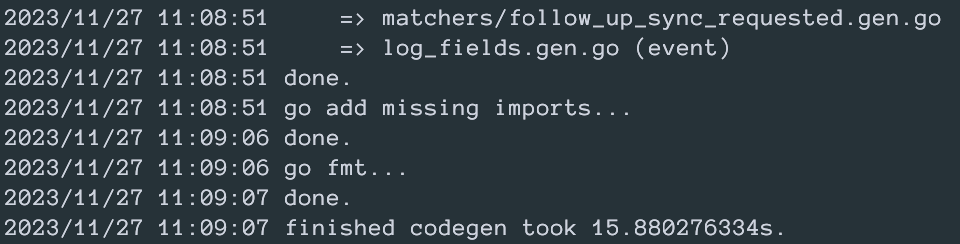 go/parser to find structs in the folder which have a magic // codegen:matcher comment above themThat really doesn’t feel like it should be very slow, after all it’s just reading a bunch of code, running some simple logic on it, and spitting out some more code… right?