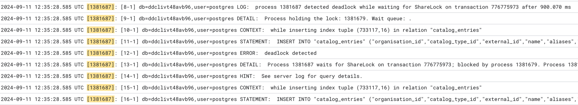 This revealed the Postgres process ID (PID) of 1381687, the query being executed and the full query blocking it, all in one. Bingo!