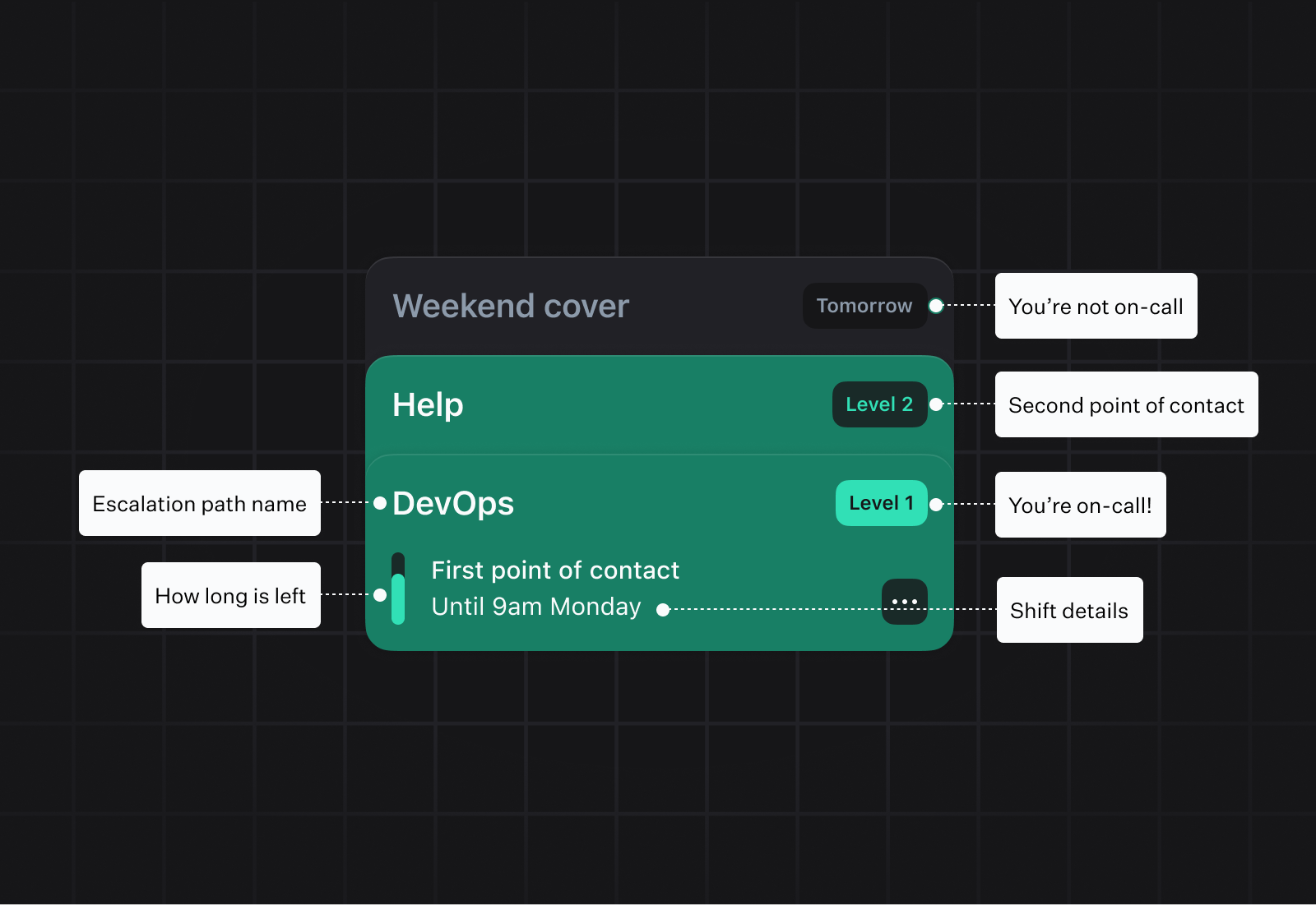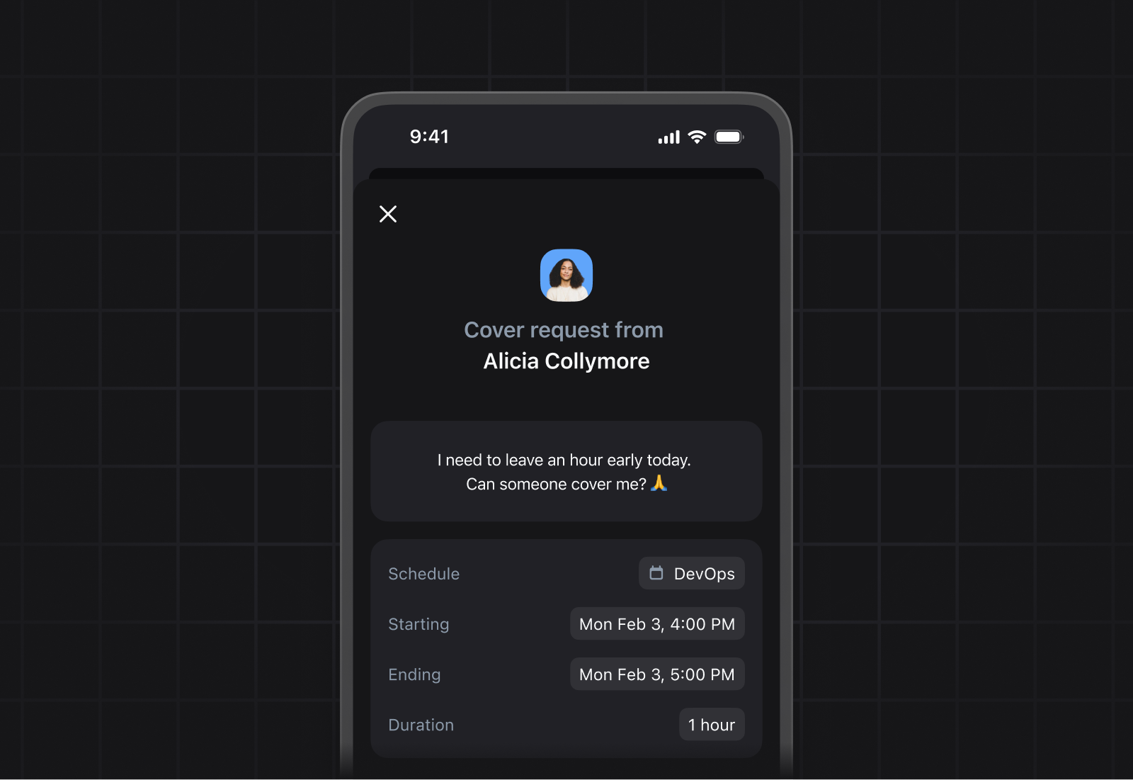 To address this we added a simple ‘cover me’ feature. A user simply selects the escalation path, picks a time, and their team will be notified.