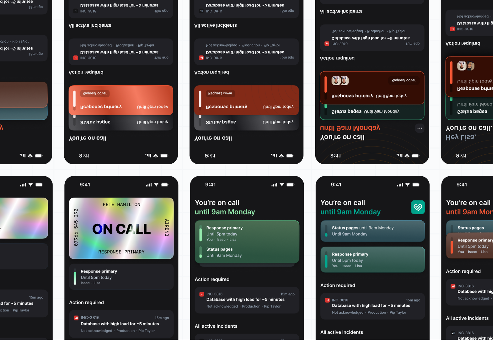 After exploring various approaches, we settled on a card metaphor to represent each escalation path (the chain of people that will be notified when something’s up) a user is present on. This would allow us to deal with a wide range of use and edge cases, and carefully prioritize information so things never felt overwhelming. Or so we thought.