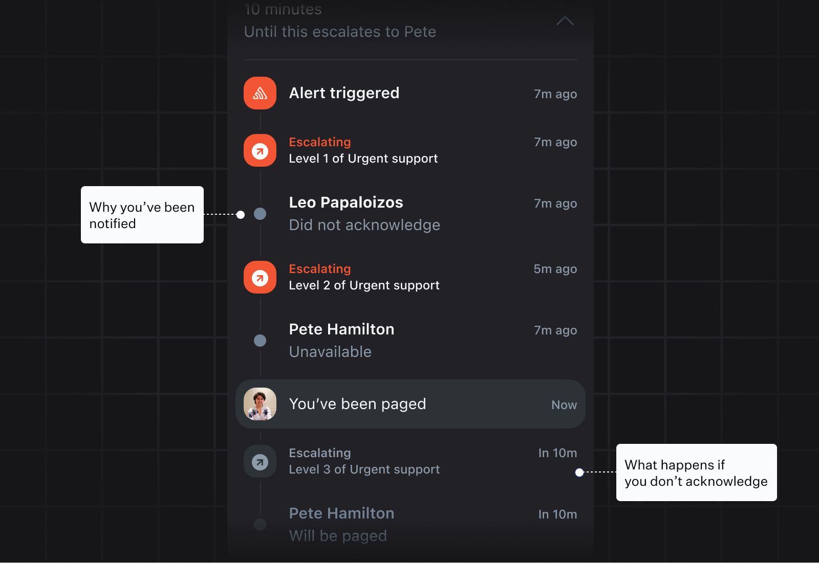 Usually, the reason for the notification is in clearly spelled out in the alert, but in the case that you’re the second, or third point of contact, you might need more information: ‘Did someone not acknowledge?’ Why not?, ‘Has someone escalated to me?’ For this, we provide a simple timeline showing the history of the alert. We collapse this by default to avoid overwhelming people when they’re under pressure.