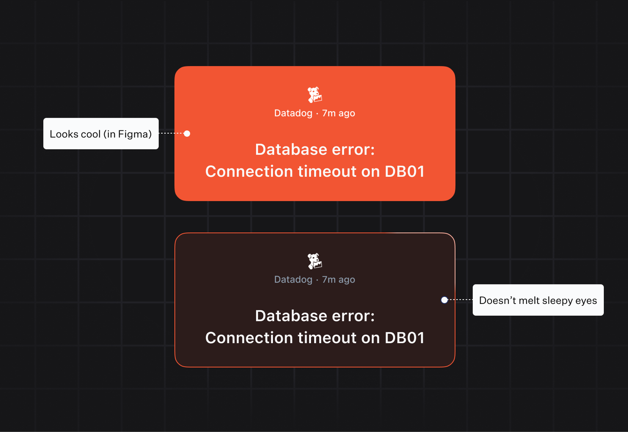 First up: shock. You’ve just woken up! It’s so bright! To combat this, we settled on dark mode by default, and only apply subtle fills on the alert screen. It’s pitch black and we don’t want to blind you before you can do your job. Take a look at the two examples, and imagine which one you’d rather be woken up by.