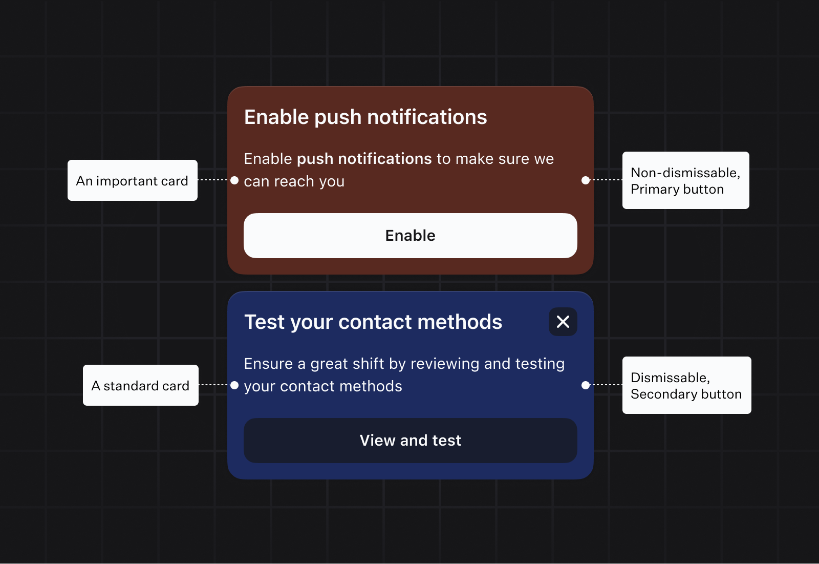 For peace of mind, we created a system of nudge-cards that encourage users to test their notifications before going on-call for the first time, and prompt them when something may not be configured correctly. These held the same basic styles as the on-call cards (think corners, bevels etc.), but had their own level of priority, depending on how important we believe the task to be.