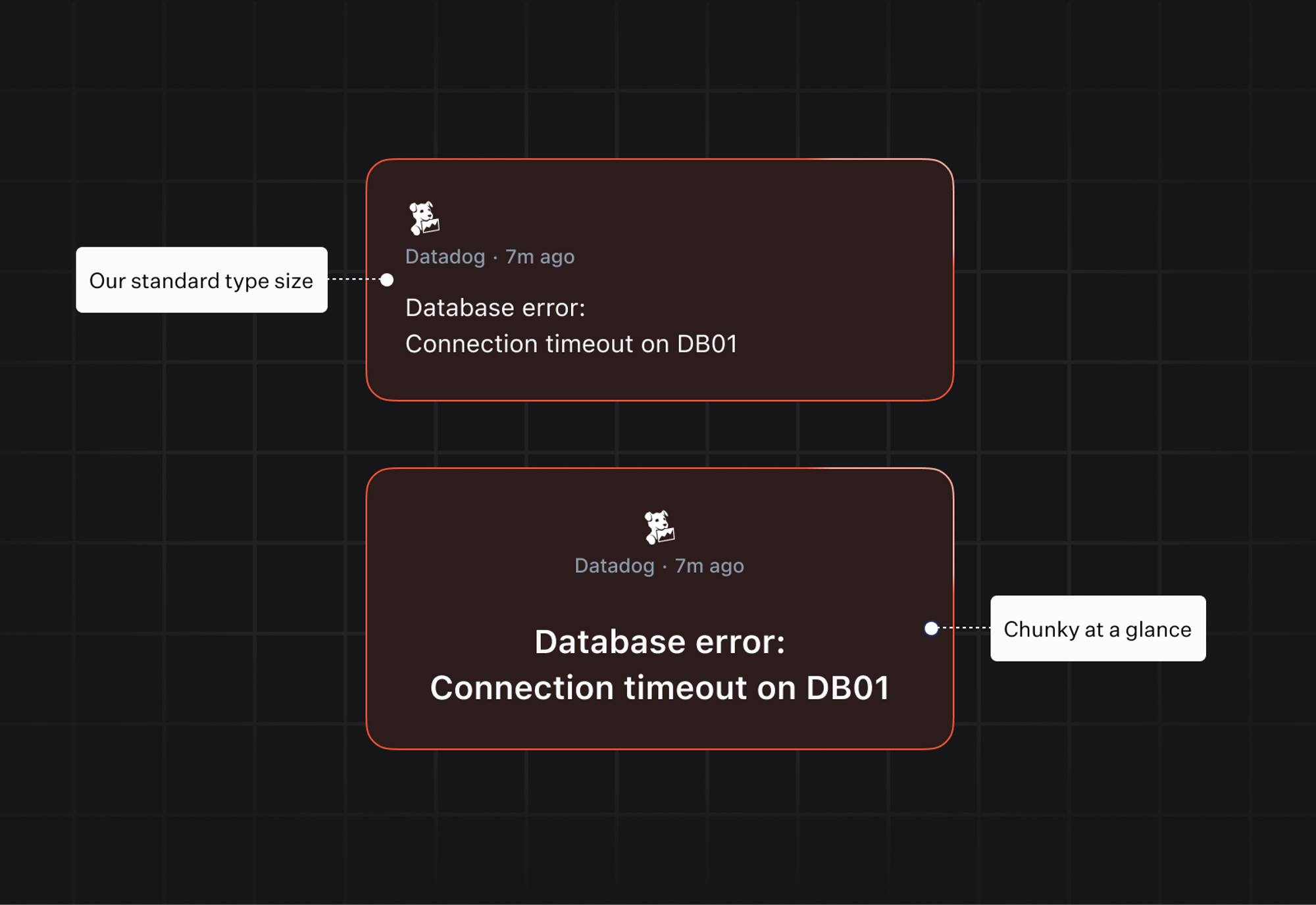 We also broke out of the type styles used elsewhere, and a introduced large text style, showing only the content of the notification. What we want you to do here is acknowledge (or not!), and then get into the details. Again, take a look at the examples below. The small text might look a bit neater, but in testing, it’s much harder to glance at and understand.