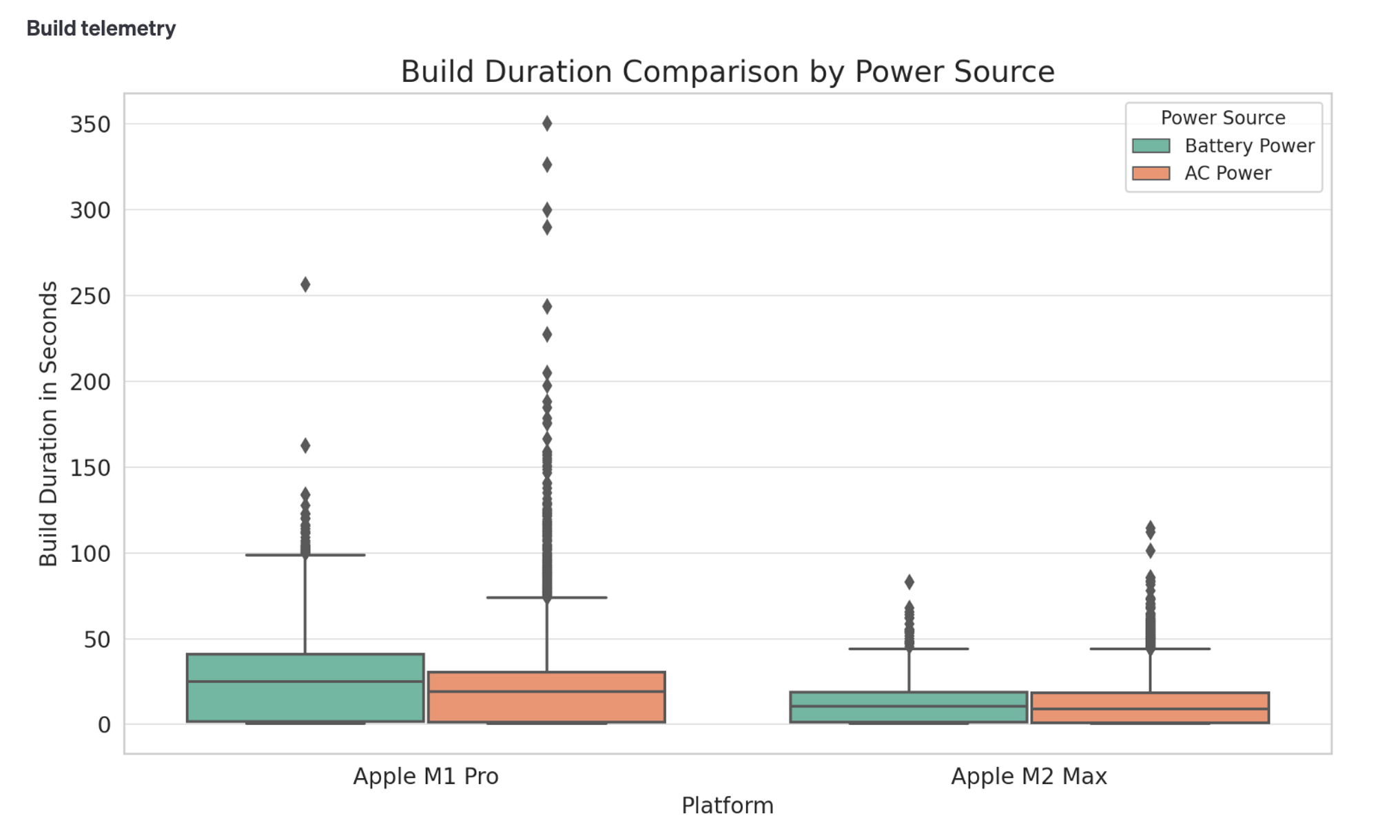 We can see that AC power is generally faster, even if we have longer builds in each AC power category (due to us doing many more builds on AC than on battery, thus finding more build outliers).