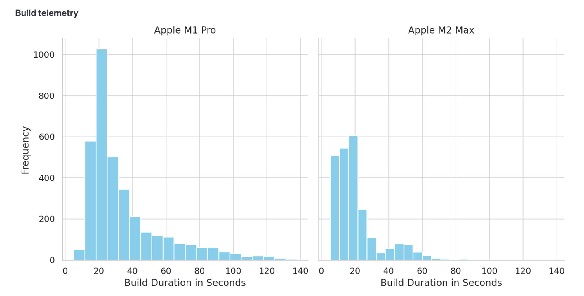 Focusing on just the M1 Pro and M2 Max (as these are the platforms we have the most data on) can you chart two histograms showing successful build durations, removing extreme outliers.