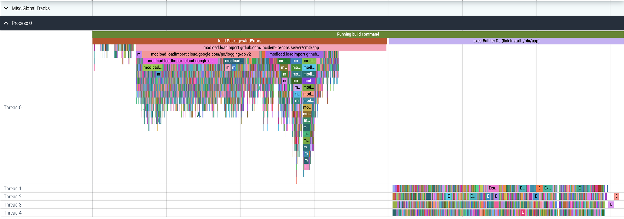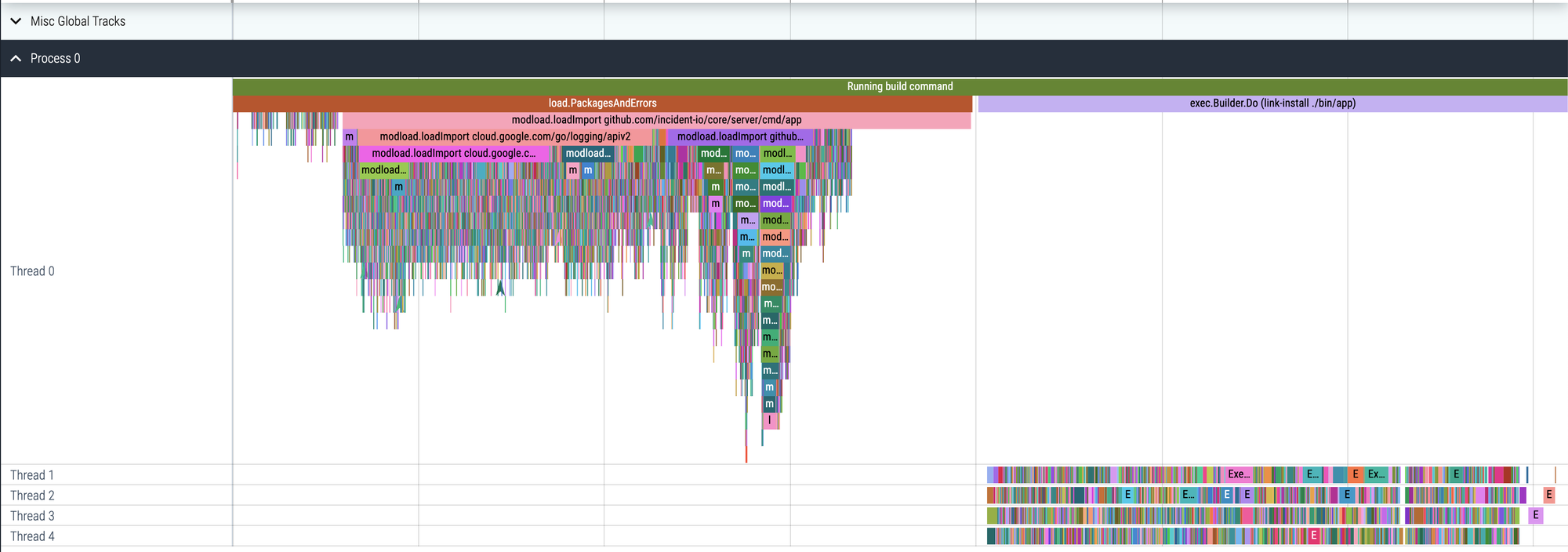 }Once we’d built the system + runtime collectors, it was simple to wrap a Go build command so we could extract build-specific measures like time in stage (linker, compile, etc) and track which files had caused us to trigger a build (more on why this is useful later).