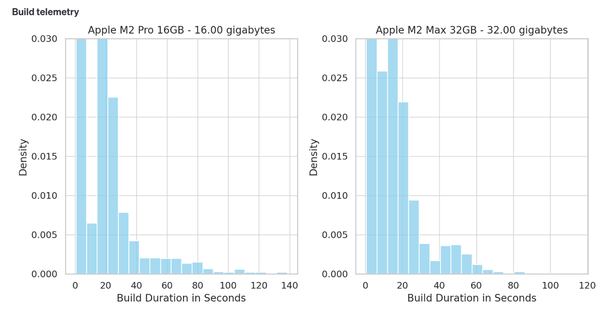 Can you redraw the histogram comparison of build durations, this time for the Apple M2 Pro 16GB and the Apple M2 Max 32GB normalized, please?