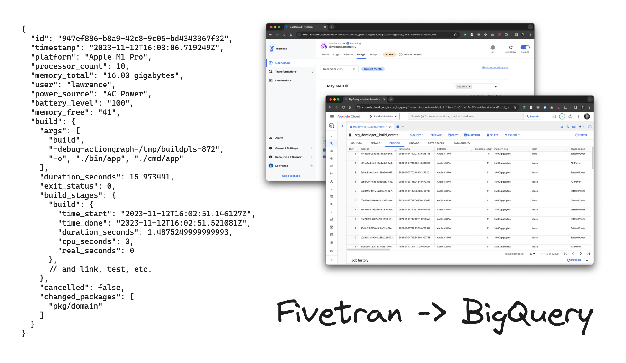 This is an invisible change to our engineering team, but meant that now – on completion of every build – we’ll send telemetry events to an HTTP endpoint of our choosing. We set up a Fivetran webhook endpoint receiver (our ETL tool, see Modern data stack for startups) that could push the events into our data warehouse, and that was it!