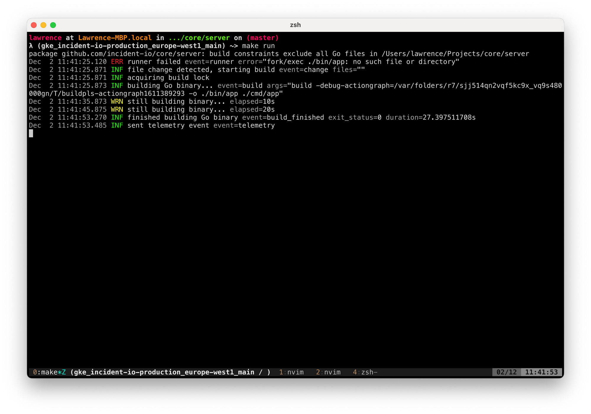 We’ve used codegangsta/gin as a hot-reloader for Go since first creating the incident.io GitHub repo. It worked well–its job being to compile and then restart the new version of the app whenever code files change–but we’d recently hit issues that had made us consider moving.