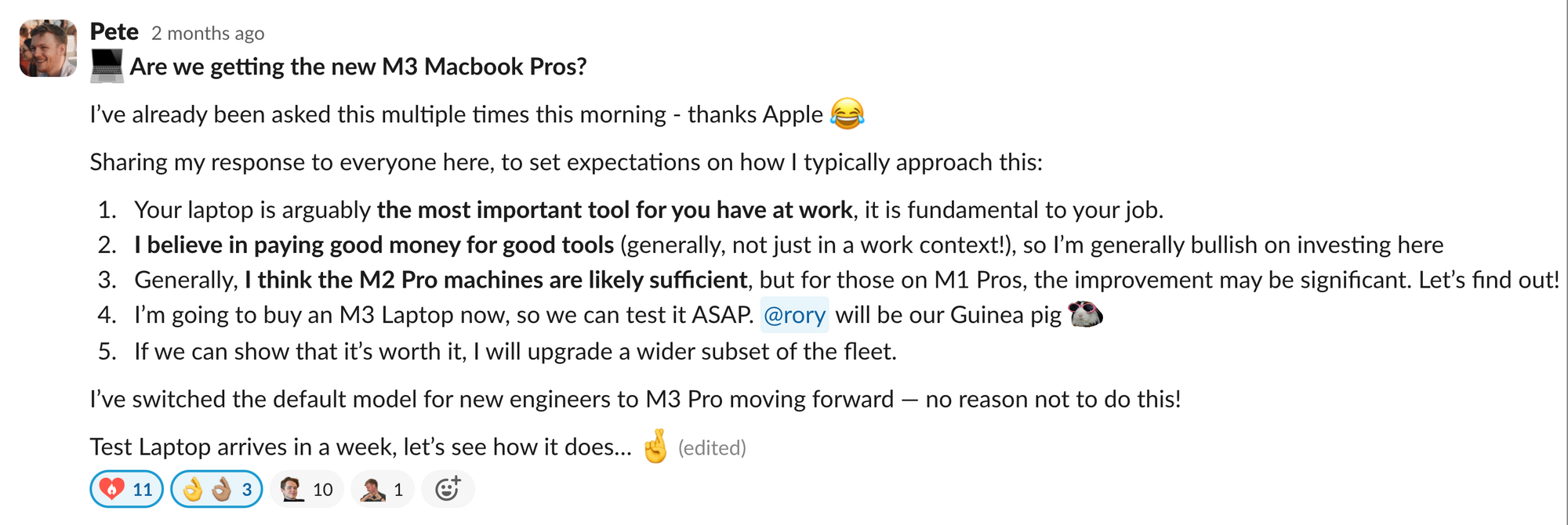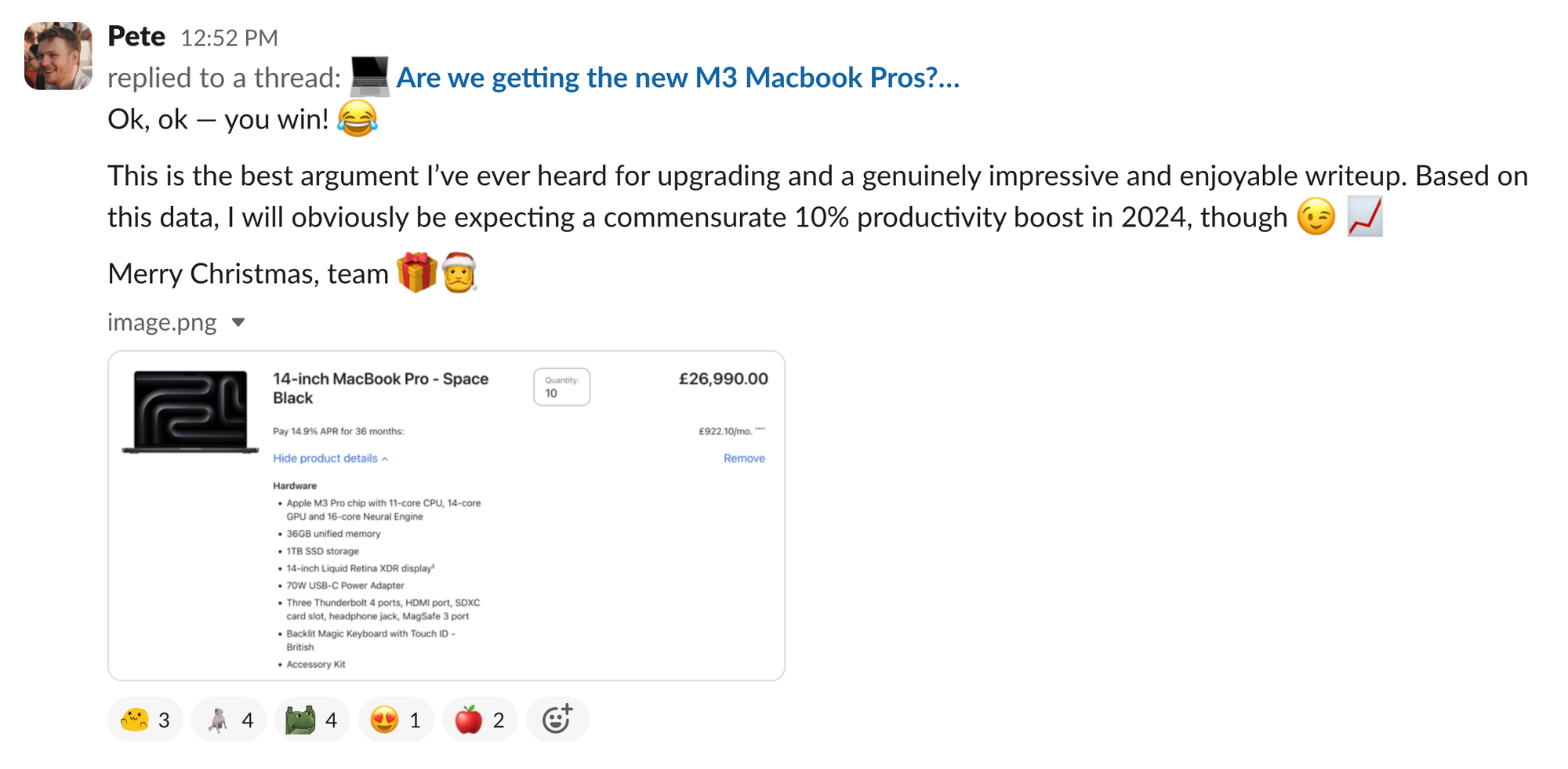 In the face of irrefutable evidence that new Space Black M3 Pro laptops would dramatically improve not only how cool we look on our commute, but also how fast we can ship changes and delight customers, the decision was an easy one and the new laptops are now on their way!