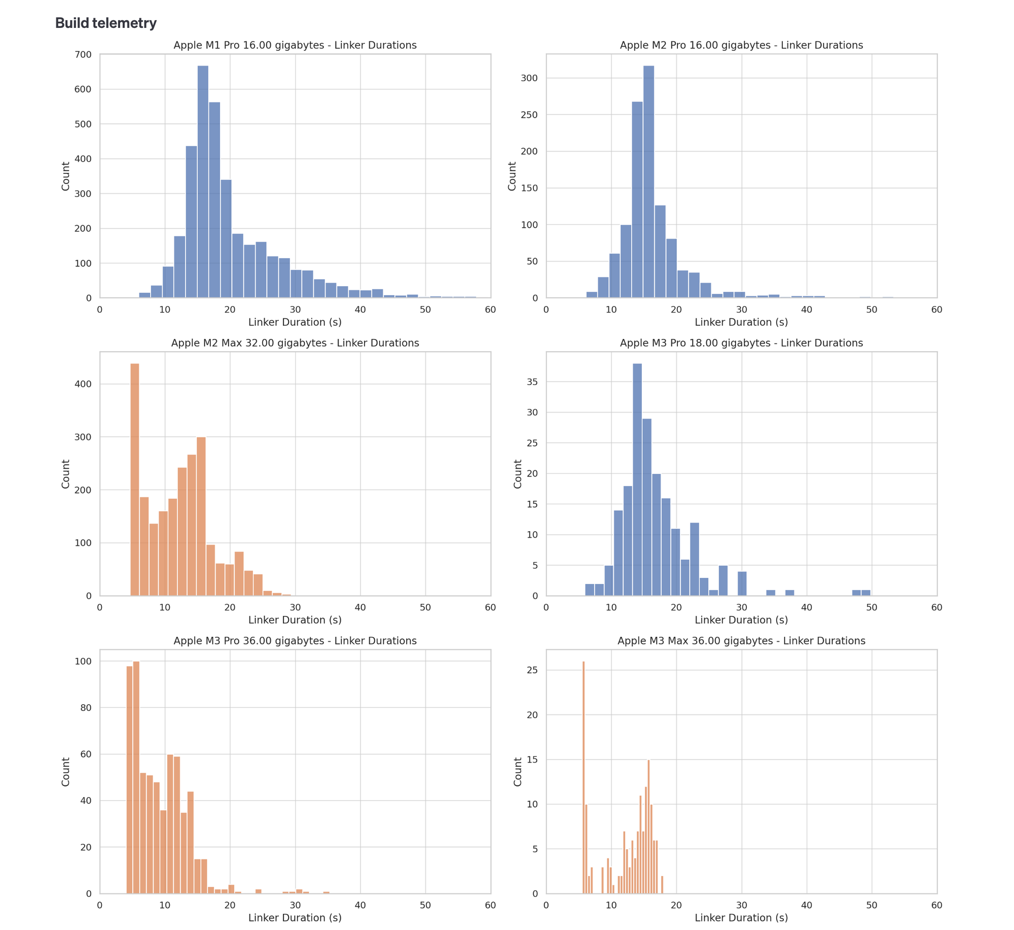 Well, that looks quite different! Which is to say every machine – M1, M2 or M3 – that has >30GB of memory almost always completes linking <20s, and only machines with 18GB or less memory routinely take >20s to link.
