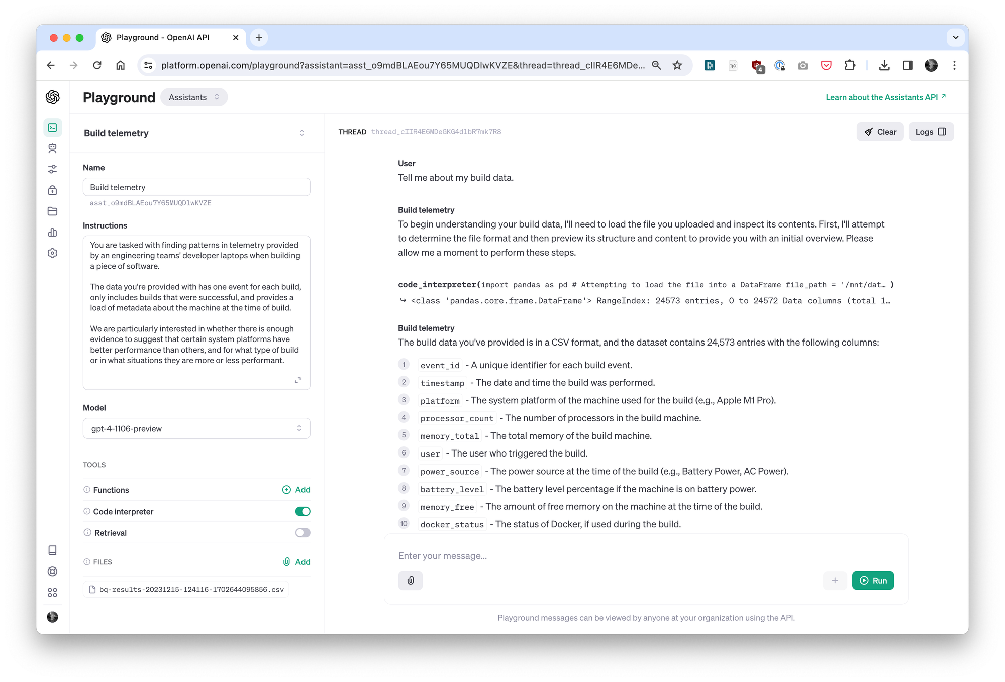 select * except(payload) from developer__build_eventsWe’re using the experimental gpt-4-1106-preview model to power our assistant, and enabled code interpreter to power the data analysis. It only took a few minutes before we had the assistant ready and responding to our questions in the playground.
