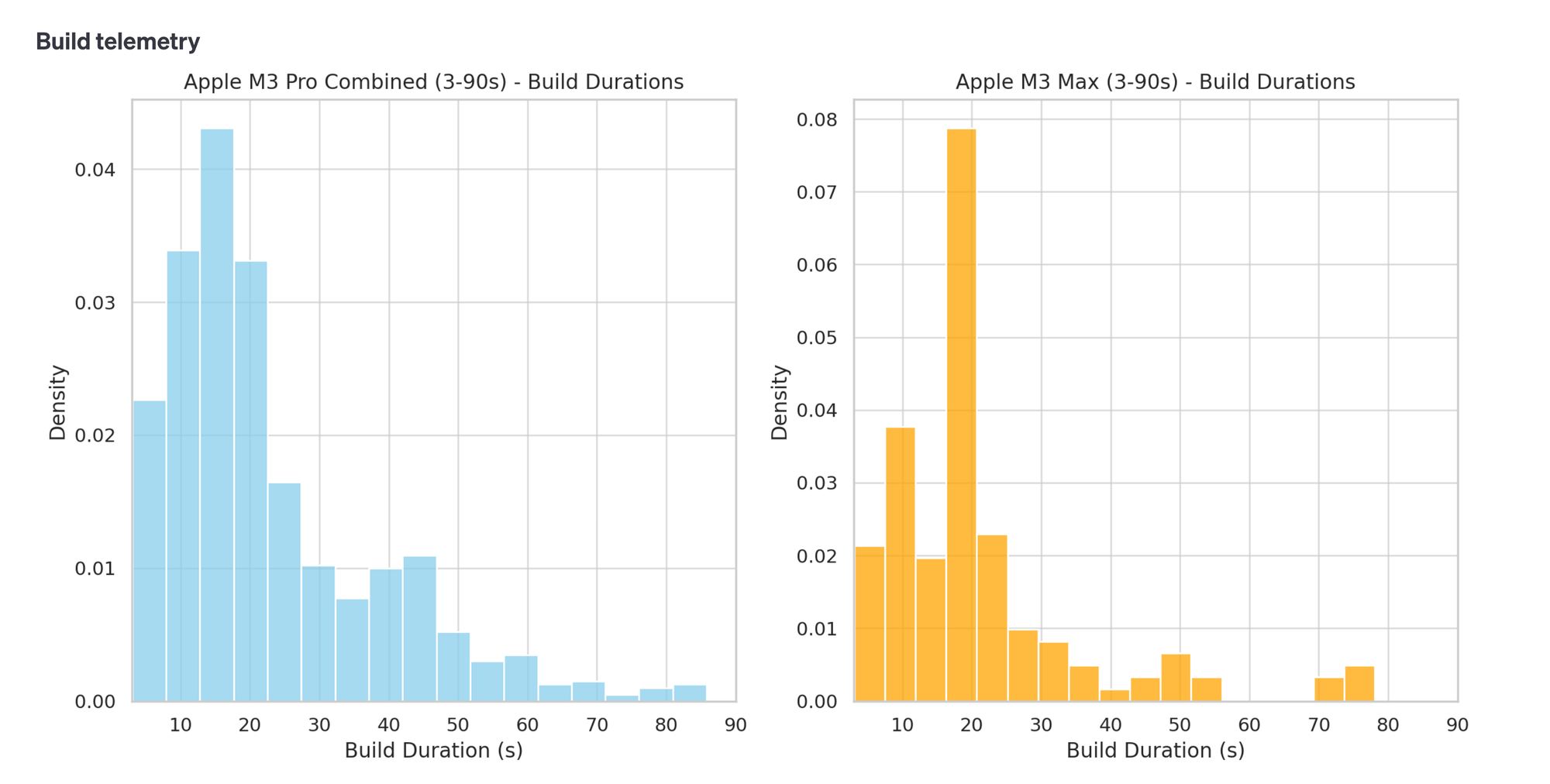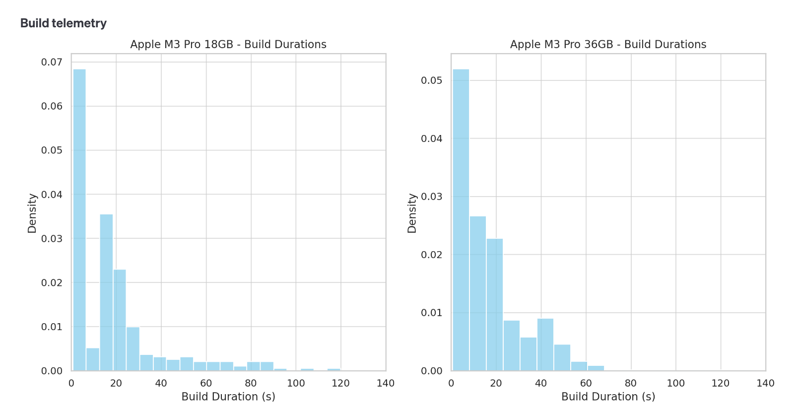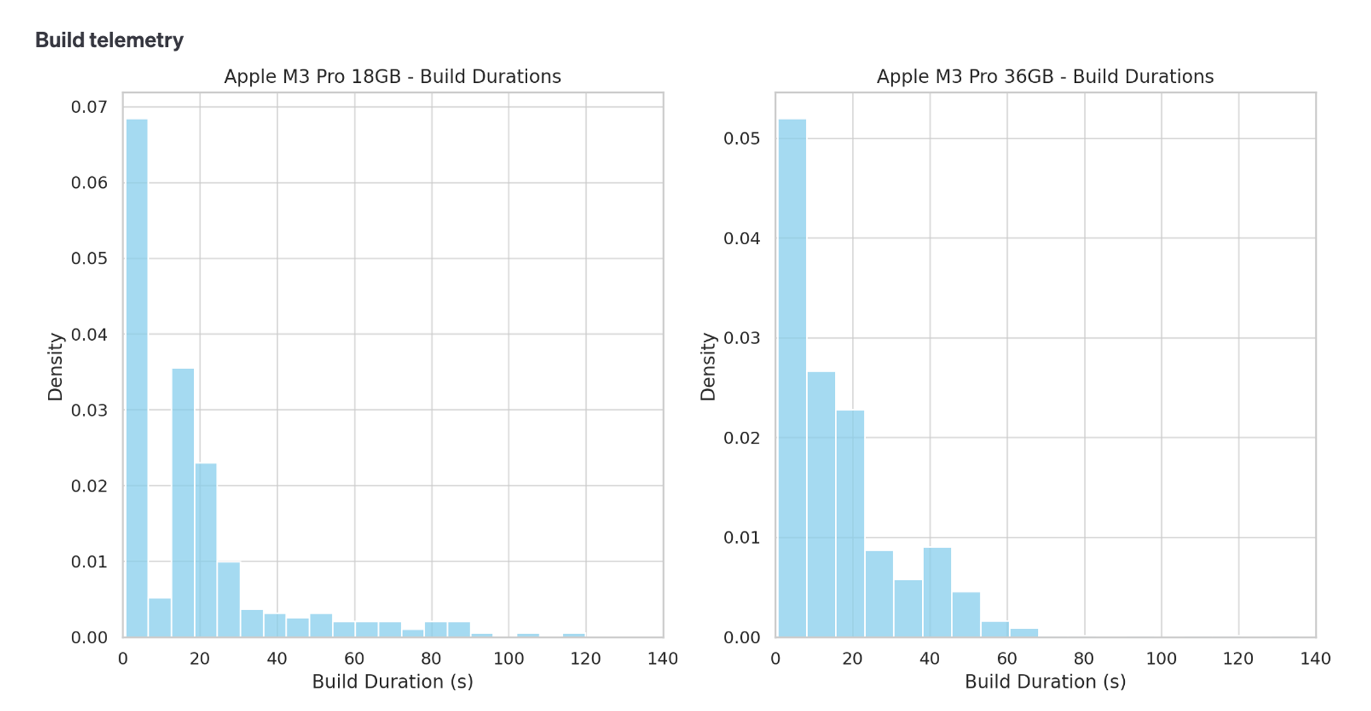 Show me histograms of build duration for the M3 Pro 18GB and 36GB combined vs the M3 Max, removing very quick builds (<3s).