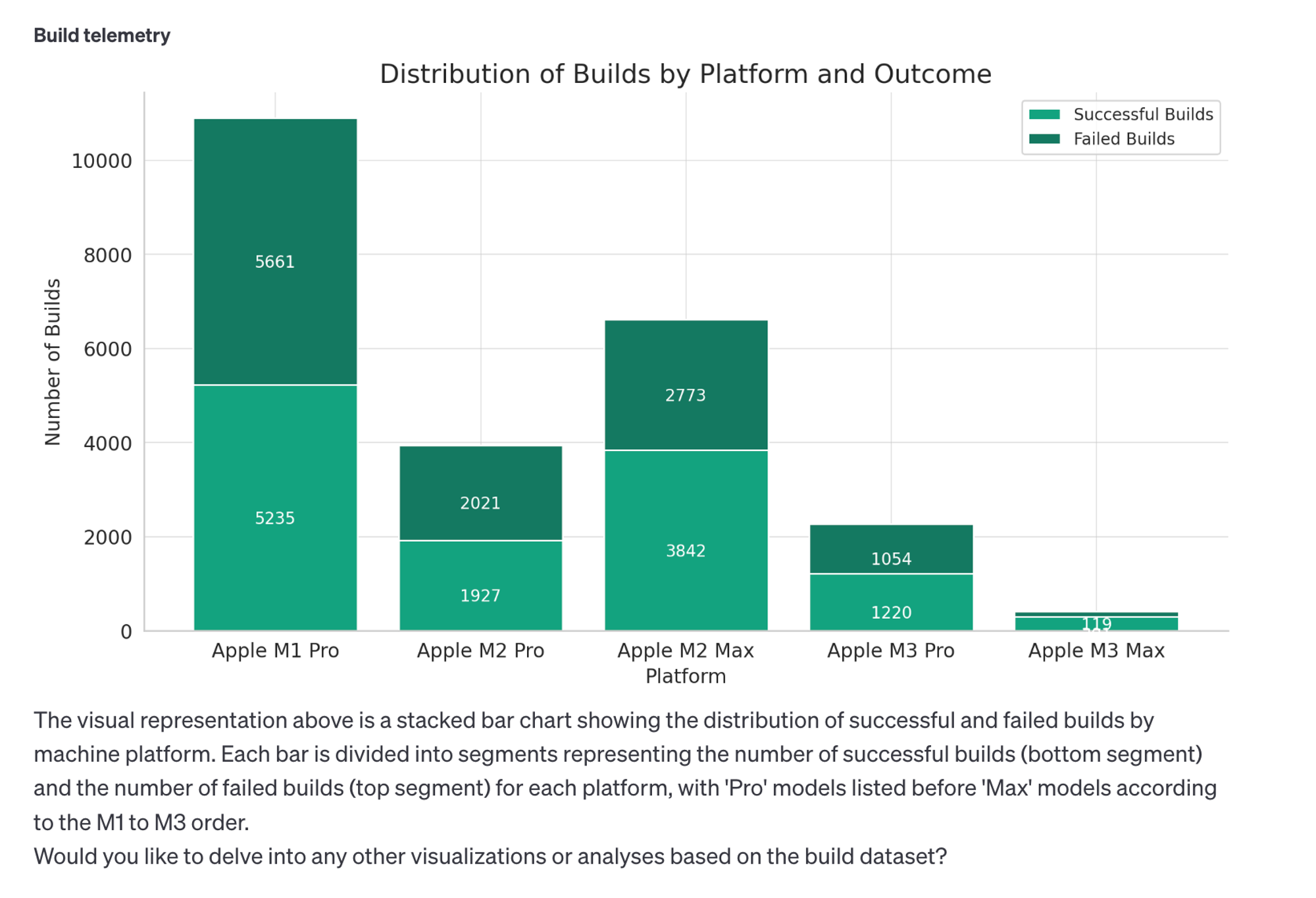 Let’s get a picture of how many of our build events are unsuccessful, along with a sense of how many builds were for each platform.