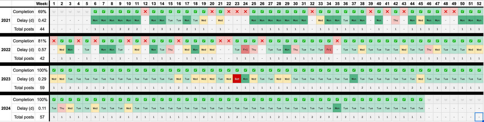 Iâm a data nerd, so naturally I have a nerdy little spreadsheet where I track everything and record out all the changelogs we publish by week, along with how delayed it was and whether we included bonus changelogs, too.