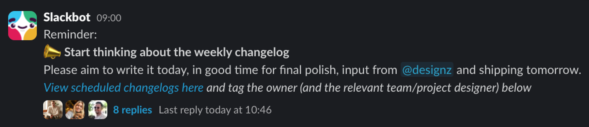 To help avoid any last minute rush, we also have an automated Slack reminder in our #changelogs channel to ensure weâll have any design assets / images ready in time.