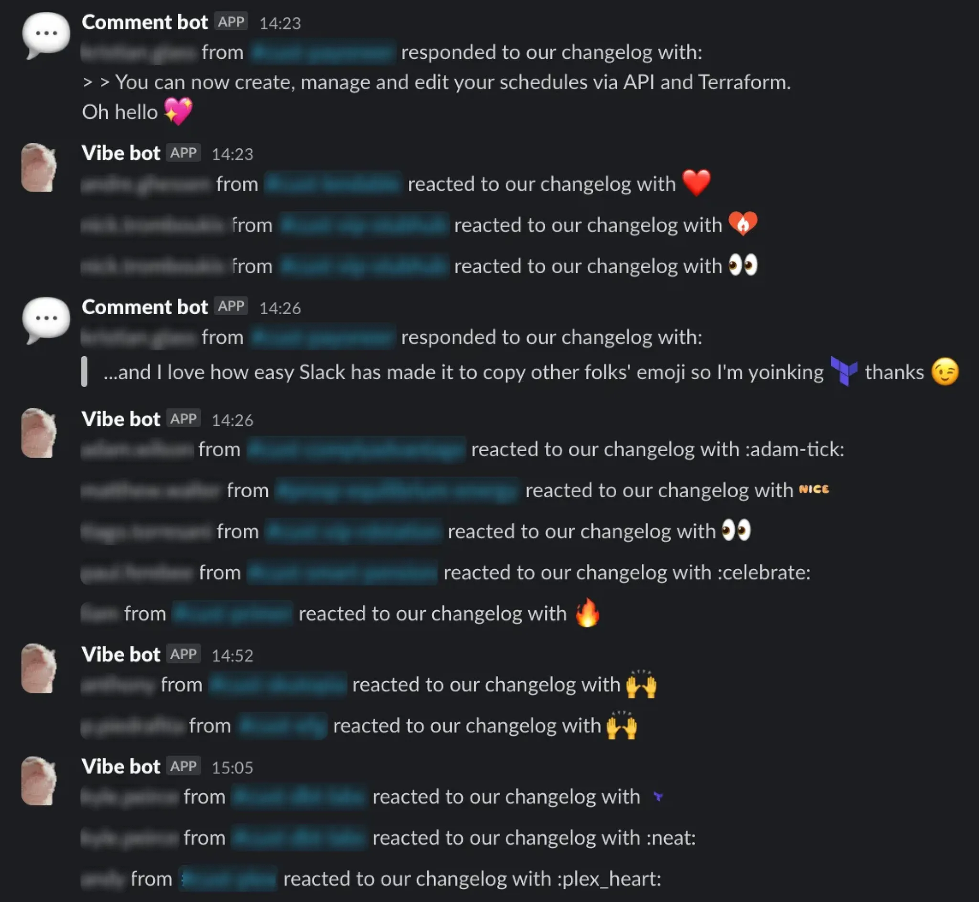 Weâve created some automation so that any emoji reactions or replies to changelog posts in customer channels get piped into #changelogs-pulse and itâs always fun getting the dopamine hit from hundreds of customers reacting and getting excited for the latest updates â¤ď¸