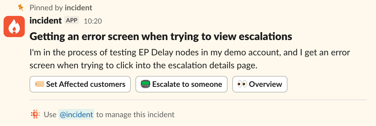 Whilst the investigation was ongoing, I was nudged in Slack to “pin” the incident in the incident.io macOS desktop app.