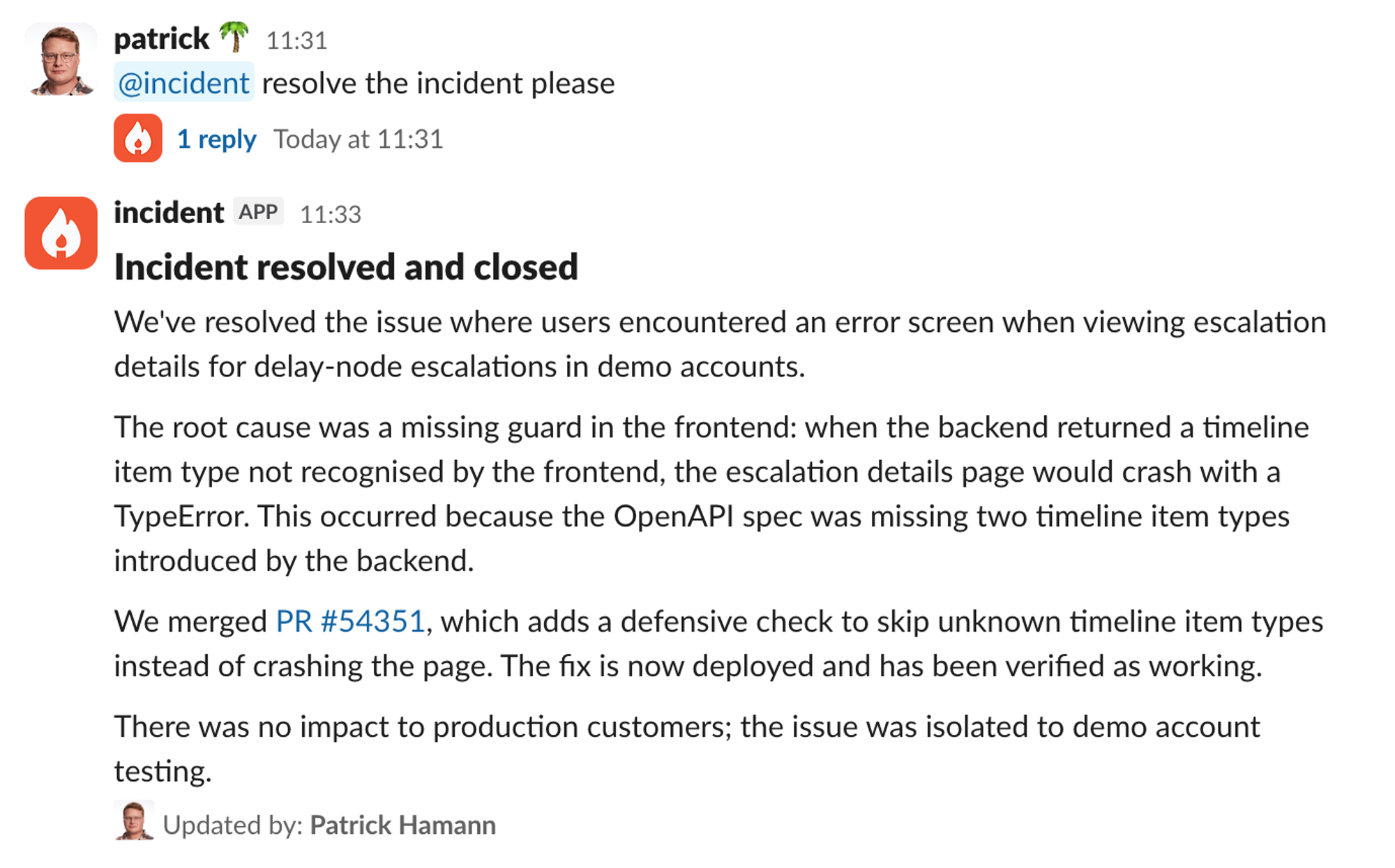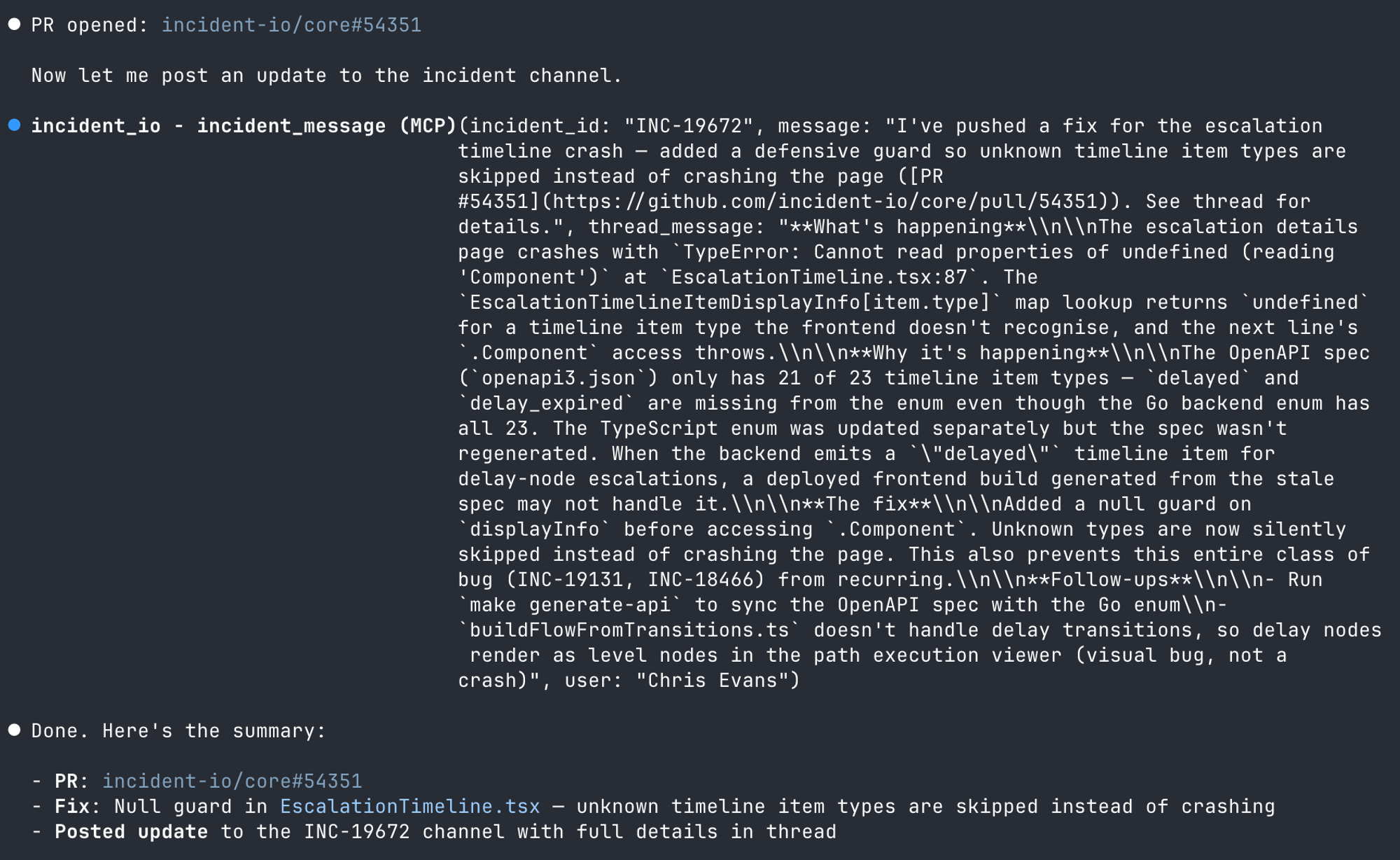 This is where the experience felt like it really clicked. Claude opened the PR, then used the incident.io MCP to post an update into the incident channel, including what was found, what the fix is, and a link to the PR.