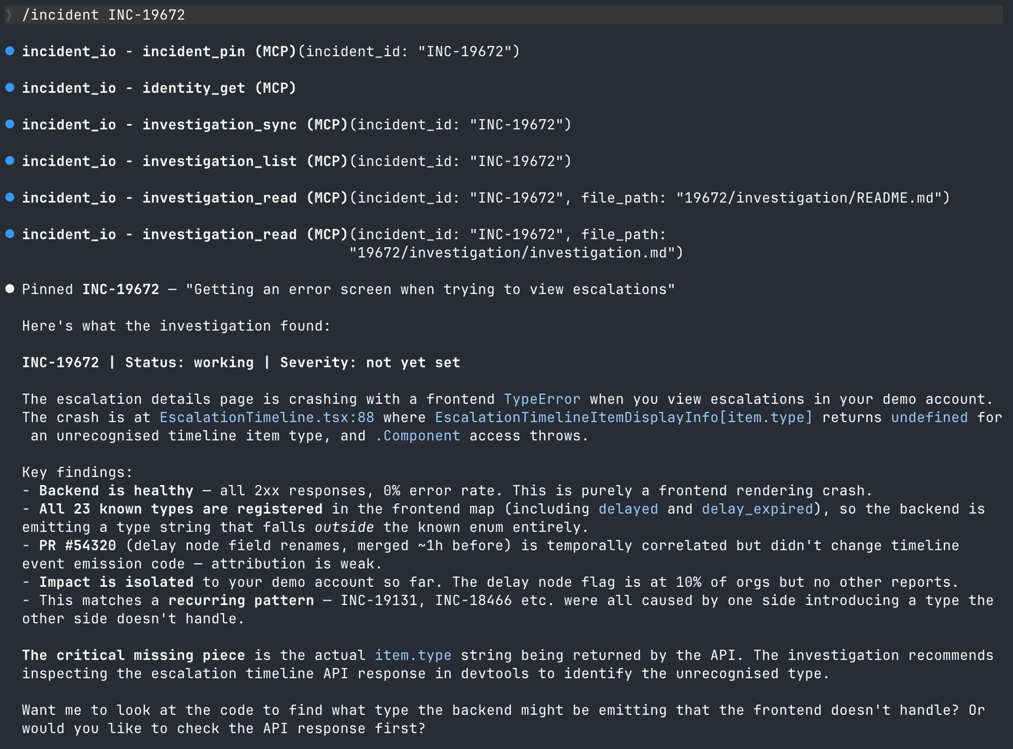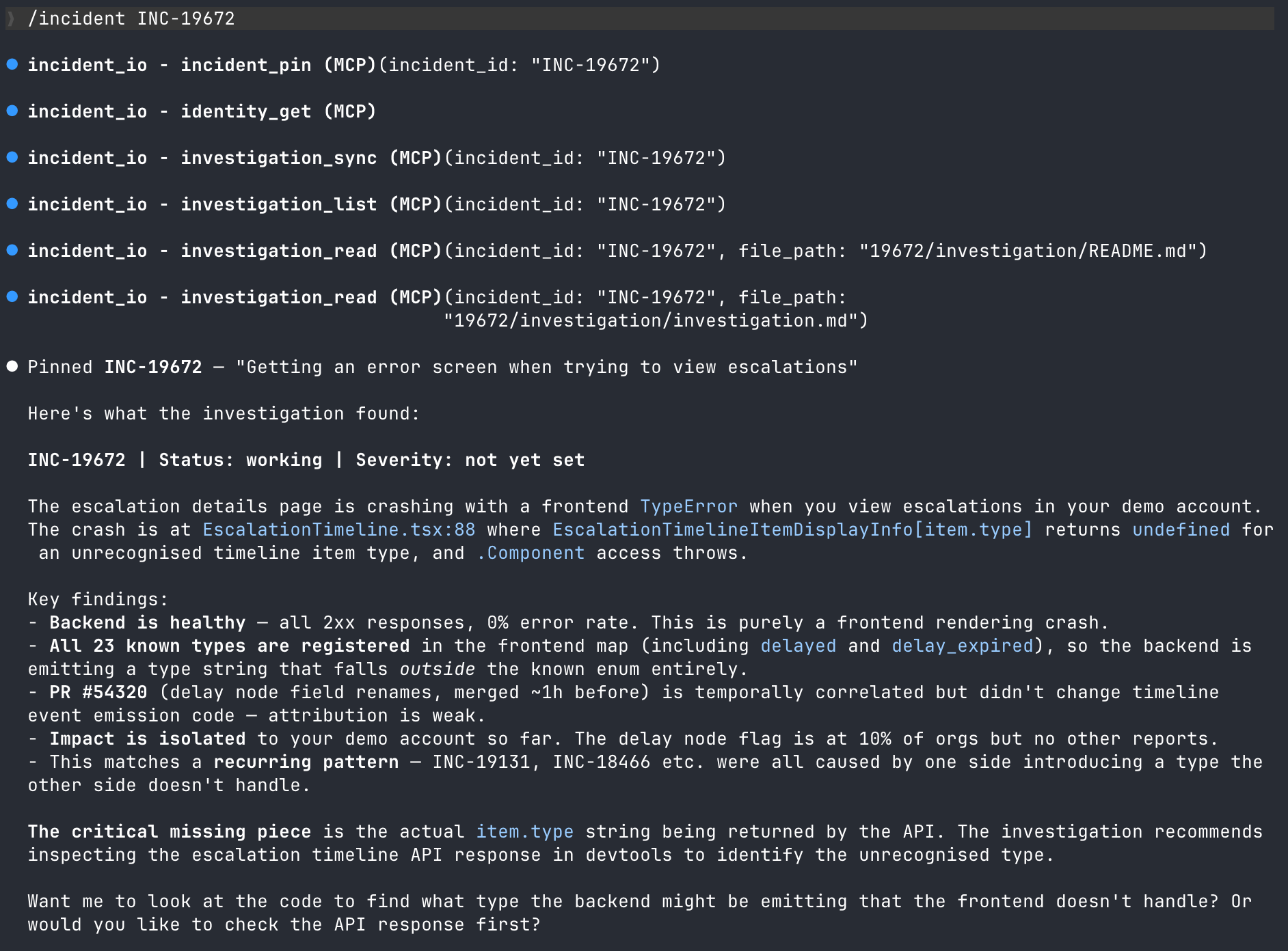 Most notably, I didn't have to switch to Slack to type an update. I didn't open GitHub to create the PR. I didn't go back to incident.io to change the status. All of it happened from the same place I was writing the fix.
