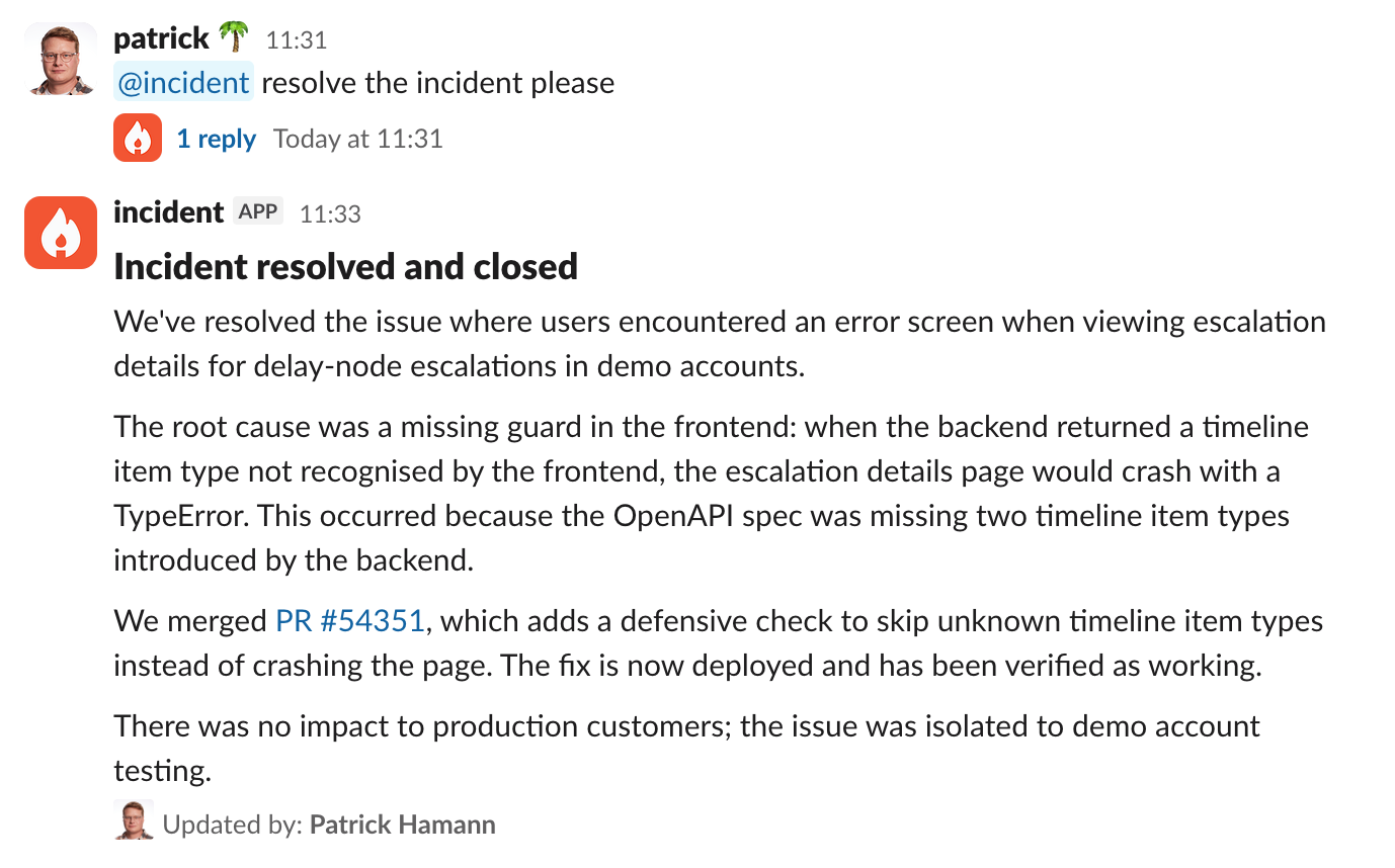 The whole process here, from incident declaration to resolution, took minutes. And most of that was waiting for the deploy.