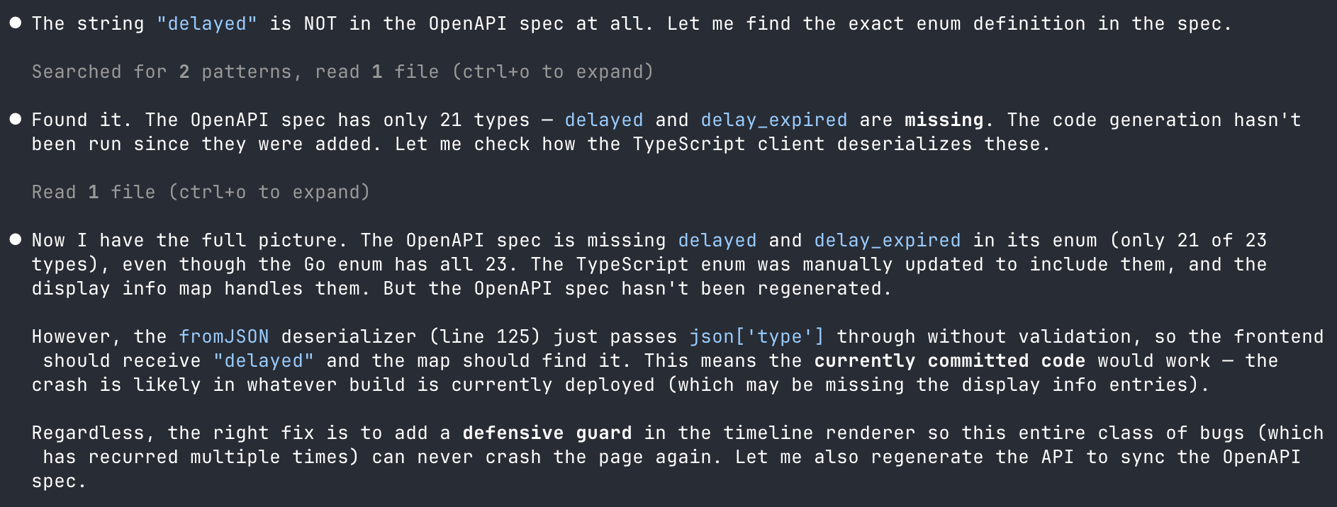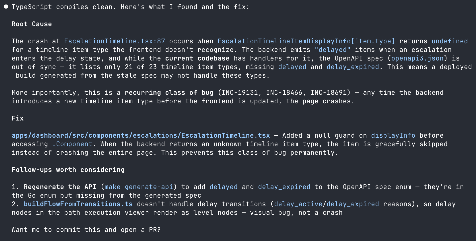 By the time I'd done that, the first pass of the investigation was complete, and had narrowed down the cause to a frontend rendering crash: a map returning undefined for a type the frontend didn't recognize. It even identified a recurring pattern from previous incidents where one side introduces a type that the other side doesn't handle – we’re now looking into this!
