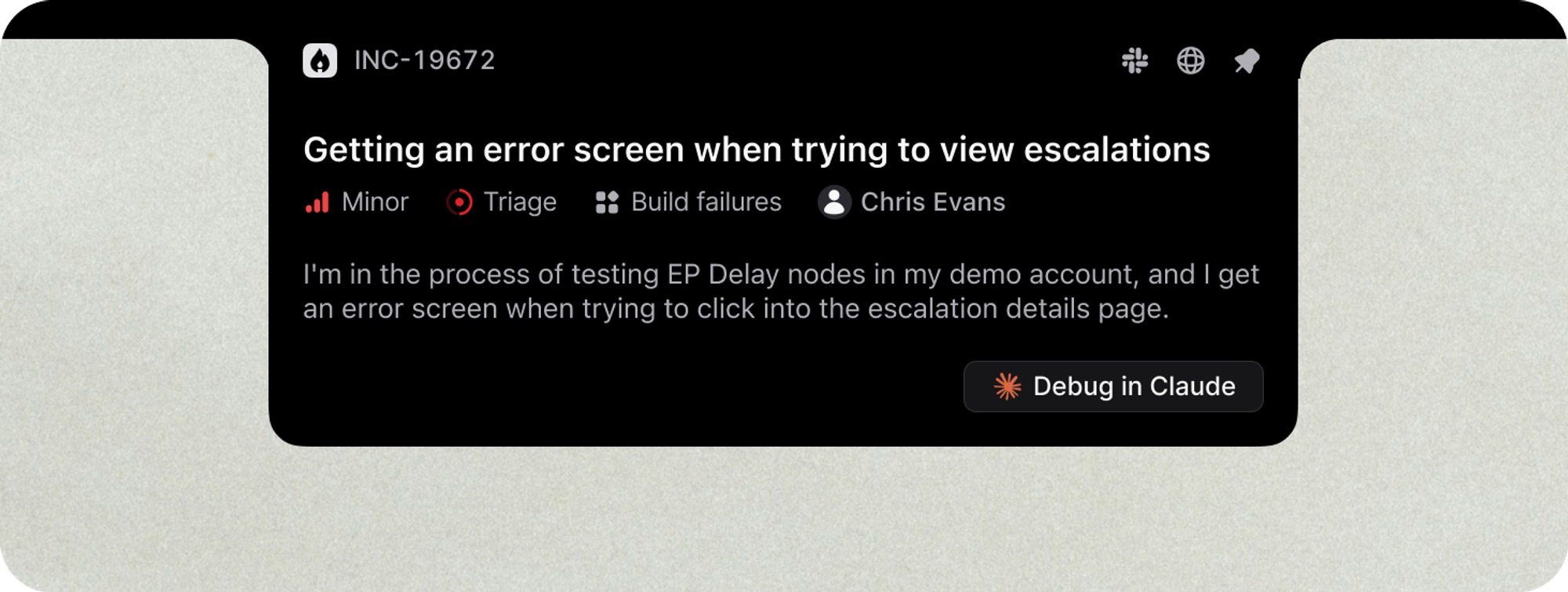 We've recently shipped this new product surface (it’s beautiful!), and pinning an incident turns the notch on your Mac into a live and interactive view of the incident, and an easy way to jump straight into Claude, Cursor, or your agentic coding platform of choice.