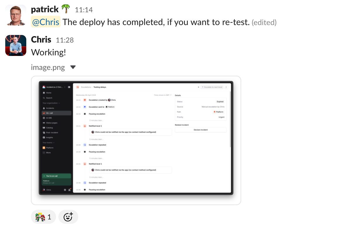 To set the scene, I was testing a new feature we’ve just built: delay nodes in escalation paths. It’s not critical to this story, but it lets you add custom delays into on-call escalations, for example holding low severity pages overnight and delivering them first thing in the morning.