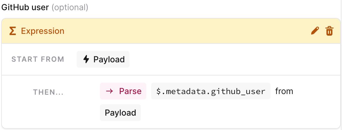 cat /tmp/alert-payload.jsonThe alert JSON payload contains useful information such as the link to the failed build in CircleCI, the most recent commit in the repo, etc. We’re also able to create custom attributes for the alert through the web app UI, using our nifty expressions builder: