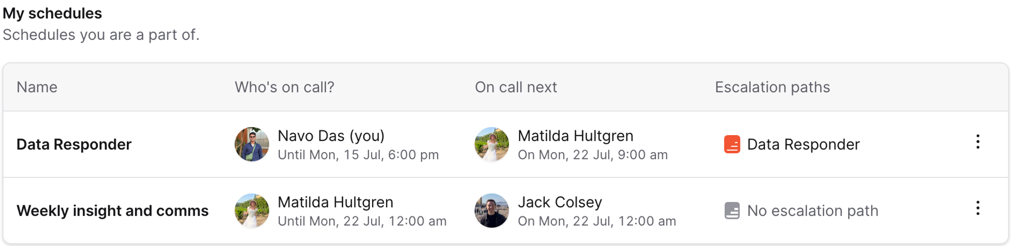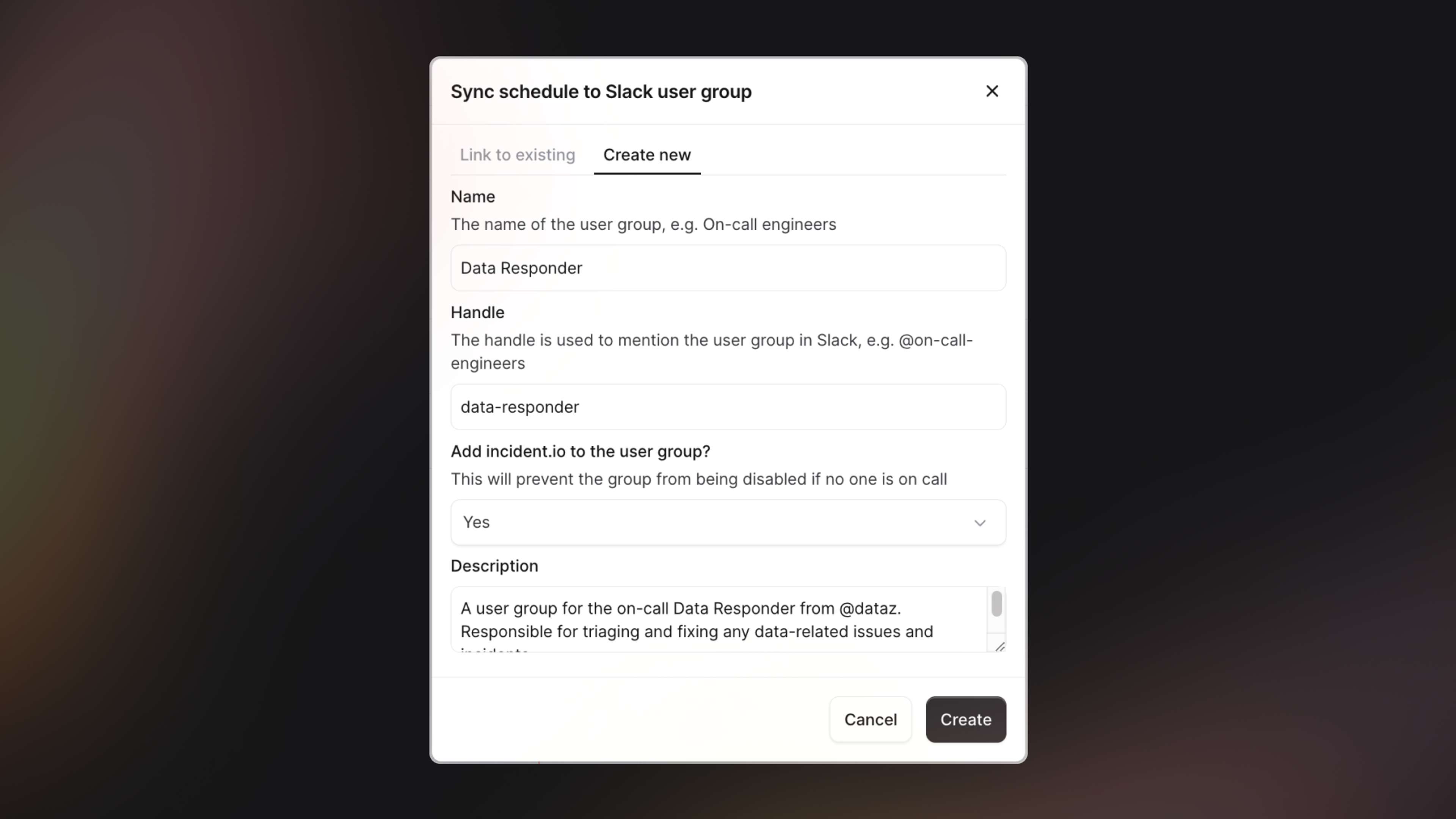 We also allow schedules to be synced to Slack user groups, which will automatically tag whoever is on-call at any given time. This means that both Slack alerts and end-users can use @data-responder to mention the team member on-call, rather than alerting the entire team.