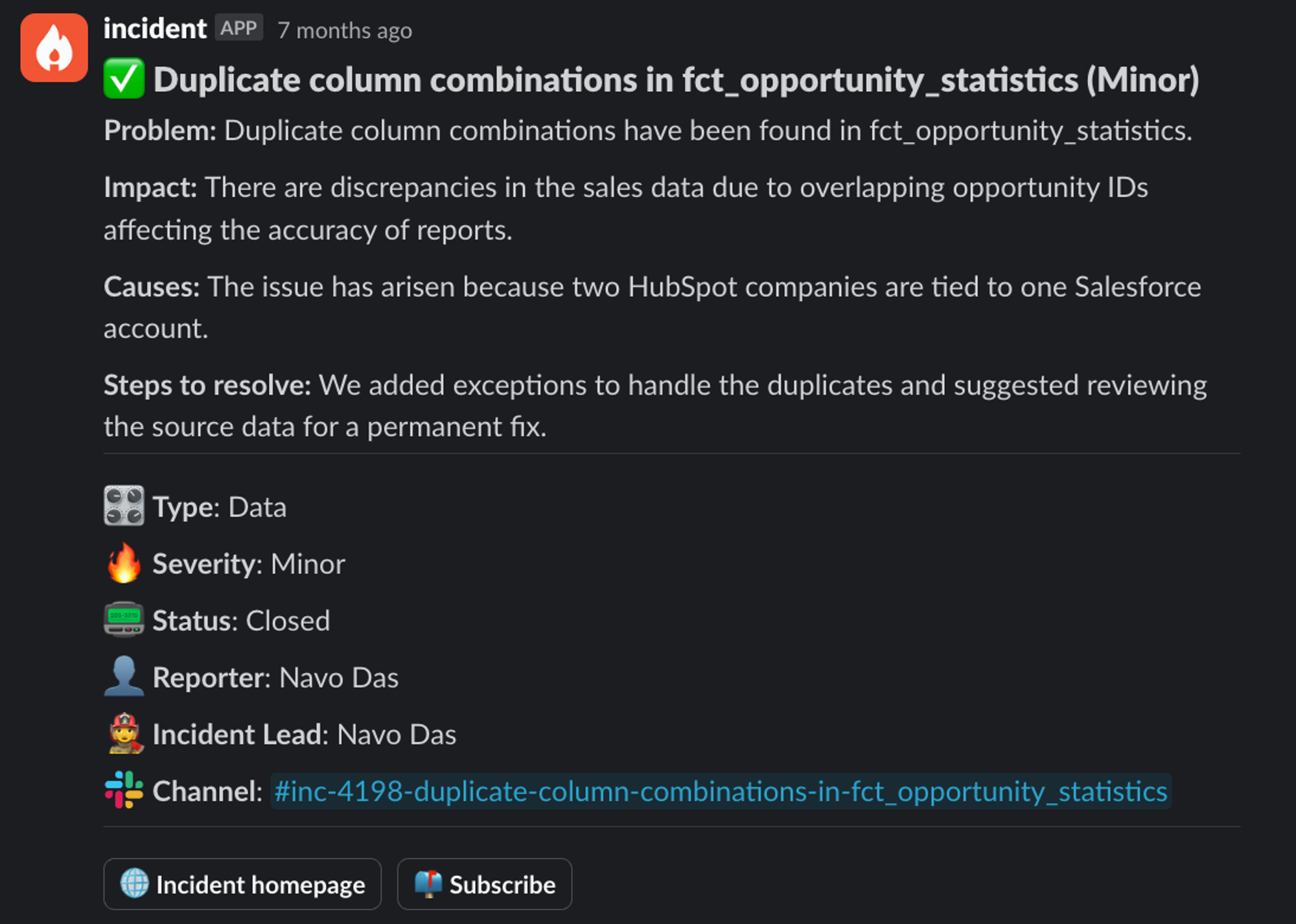 At incident.io, the Data team works across multiple areas of the business, enabling go-to-market and product teams alike to make data-driven decisions. Given our broad involvement, we’re no stranger to data incidents and are heavy users of our product to monitor, triage, and respond to them. Here’s a quick run-through of how we’ve set this up.