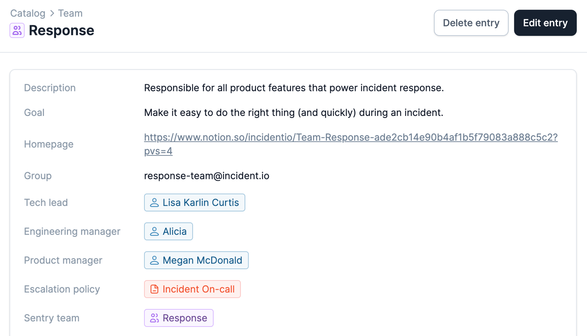 Both types we've created above relate to teams, and this is where we feel Catalog becomes really powerful for us. This screenshot of the "Response" team shows you what our end goal is: