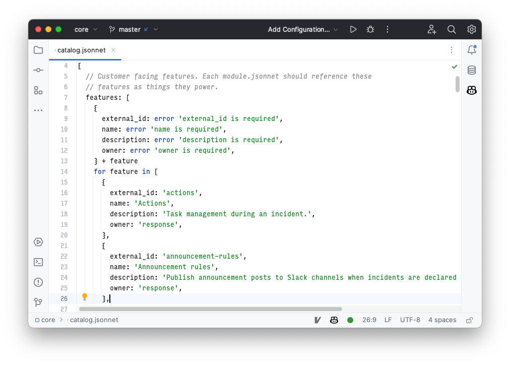 We have strong structures and patterns in place for features in our codebase. Each feature gets a Go module in the app directory. Each of these modules contains a module.jsonnet file that describes which team owns that module.