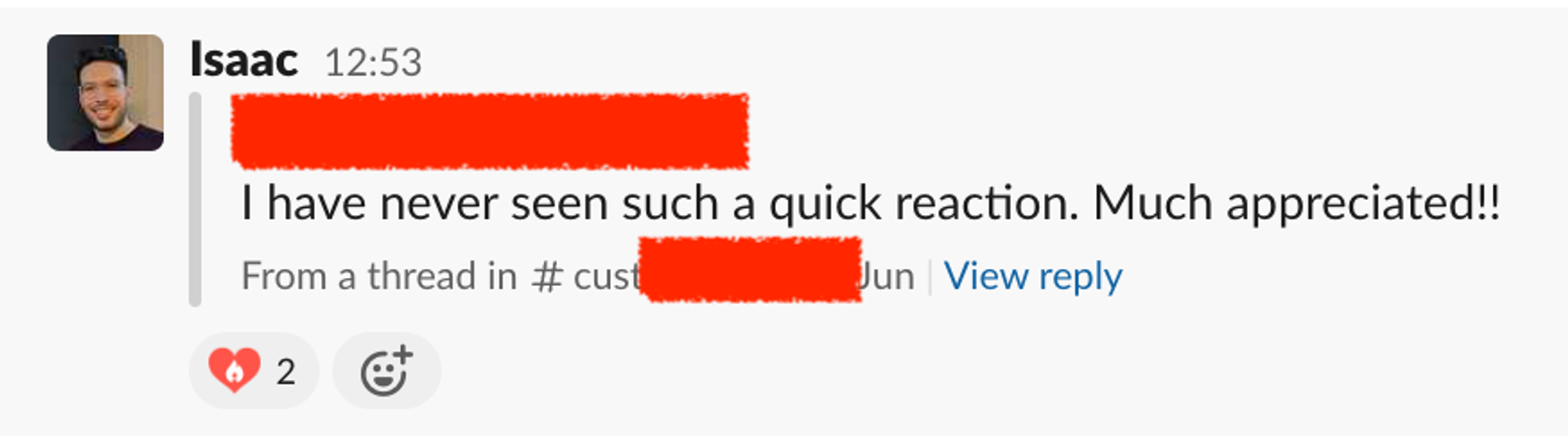 A big part of why we can fix issues quickly is the ‘Product Responder,’ which is a rotative role played by engineers who dedicate their week to resolve issues that are in the way of the reliability of our product, affecting a particular customer or group of customers.